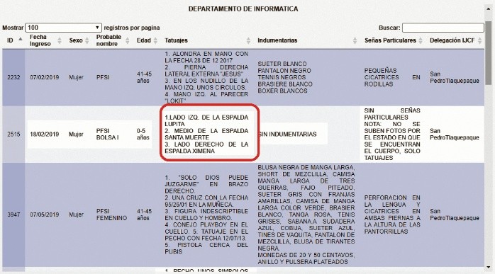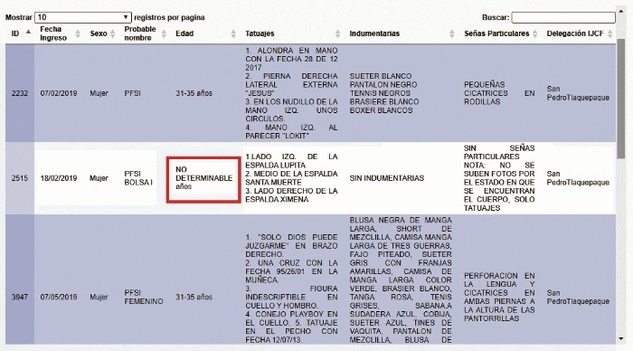 La plataforma “Registro de Personas Fallecidas Sin Identificar (PFSI)”, con la que los ciudadanos podrán consultar la descripción de este tipo de cuerpos que están bajo resguardo del Instituto Jalisciense de Ciencias Forenses (IJCF), se presentó con fallas.La lista, que cuenta con datos de 814 cadáveres hallados desde el 19 de septiembre de 2018 hasta la fecha, se dio a conocer con errores en las edades.Por ejemplo, los resultados de las búsquedas arrojaron que restos de hombres y mujeres de entre cero y cinco años tenían múltiples tatuajes y perforaciones, e incluso ropa interior que no corresponde a esas edades.Al advertir esta situación, durante la tarde de ayer el IJCF cambió ese rango de edad por la leyenda “no determinable años”.En ese sentido, el director de la dependencia, Gustavo Quezada, admitió que la plataforma se dio a conocer con irregularidades. “Nos vimos en el dilema de que ya necesitábamos lanzarla para poder tener algunos casos a favor y estar mejorándola”.Karolina Chimiak, investigadora del Centro de Justicia para la Paz y el Desarrollo (Cepad), consideró que las autoridades estatales se precipitaron al publicarla.“Cuestiona la credibilidad de esta plataforma y la certeza de la información que se encuentra en la misma, y si bien es muy importante crear este tipo de avances, pudo ser una decisión mucho más adecuada esperar unos días”, dijo.El gobernador Enrique Alfaro detalló que la herramienta permitirá a cualquiera, con acceso a internet, consultar extractos del sistema de identificación del archivo básico y conocer, a través de descripciones de prendas, tatuajes e información como sexo, edad o señas particulares, si su familiar o algún ser querido están en manos del IJCF.Sin especificar la edad se encuentran más de la mitad de los 814 datos de personas no identificadas que contiene la plataforma que ayer presentó y publicó el Instituto Jalisciense de Ciencias Forenses (IJCF) para facilitar su reconocimiento, a fin de que los familiares puedan sepultarlos.Actualmente, el micrositio cuenta con datos de personas en resguardo del IJCF que han sido localizadas desde el 19 de septiembre de 2018 y hasta la fecha. Y entre la información que aporta la autoridad forense destacan el sexo, la edad, los rasgos característicos y, si es el caso, si el fallecido tiene tatuajes, entre otros.La razón de ser de la plataforma es darle la mayor publicidad a esa información para que quienes cuentan con familiares o conocidos desaparecidos la consulten, y así encontrar si alguna de las descripciones encaja con la de la persona que buscan.Pero uno de los parámetros más importantes: la edad, no está precisada en 432 de esos casos, según una revisión hecha por este medio.Anna Karolina Chimiak, investigadora del Centro de Justicia para la Paz y el Desarrollo (Cepad), lamentó la falta de precisión en este apartado. “Obviamente no ayuda a esta búsqueda más específica, más personalizada y más detallada en cuando a la búsqueda de las personas concretas desaparecidas, que pudieran estar resguardadas en el Instituto Jalisciense de Ciencias Forenses”.Gustavo Quezada Esparza, director del IJCF, aseguró que en los próximos días se exigirá a las áreas que se encargan del llenado de los registros precisar los rangos de edades. “Si es por alguna omisión o algo, que de inmediato la subsanen. Y si es por otra causa, tener nosotros el argumento que así lo avale”.Chimiak explicó que, sin atender esa arista, difícilmente será realmente útil la plataforma para la identificación de las personas halladas.“Un aspecto muy importante en cuanto a las fallas e inconsistencias es la importancia de generar la capacitación adecuada de las personas que se encargan de la sistematización, de recabar y actualizar la información de las personas fallecidas no identificadas”.A su vez, manifestó la necesidad de que los campos de búsqueda incluyan otras variables, como el lugar del hallazgo, a fin de ampliar las posibilidades de éxito en las identificaciones. “Conocer en qué municipio se halló el cuerpo también podría dar mucha más información y ser de mucha más utilidad, en posibilidad de generar mayores coincidencias y procesos de identificación”.La herramienta de búsqueda se encuentra en el siguiente enlace: http://cienciasforenses.jalisco.gob.mx/registro_pfsi.php.Cuando se presentó la herramienta, los indicadores mostraban datos particularmente inusuales, como información de menores de edad que tenían entre cero y cinco años, y entre cuyas características se destacaban varios tatuajes. El caso en la imagen es el cuerpo de una niña que entra en ese rango, y quien incluso tiene una imagen de la Santa Muerte en la espalda.Rato después, cuando se comenzó a difundir esa información por internet, en el Instituto Jalisciense de Ciencias Forenses comenzaron a modificar las edades de cero a cinco años. En su lugar destacaron la frase “no determinable años” en mayúsculas. Según un conteo hecho por este medio, ese indicador se repite en 432 de los 814 registros. Equivale a 53 por ciento.La plataforma “Registro de Personas Fallecidas Sin Identificar (PFSI)” tuvo su origen en los colectivos de familiares de desaparecidos, recordó Anna Karolina Chimiak, integrante del Centro de Justicia para la Paz y el Desarrollo (Cepad).Destacó que, ante la falta de información de las autoridades sobre las personas sin identificar en resguardo del IJCF, los colectivos comenzaron a divulgar en redes sociales las características de los cuerpos que se encontraban, principalmente los tatuajes.“(La plataforma PFSI) ha tenido antecedentes del valioso trabajo que realizan familiares de personas desaparecidas, en la publicación y difusión de información relacionada con los procesos de identificación forense, y que suplían las mismas obligaciones del Estado”.Sin embargo, la investigadora reconoció que la publicación de 