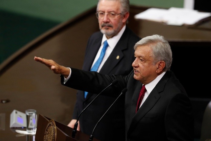 En punto de las 11:22 Andrés Manuel López Obrador se convirtió en el Presidente de la República al recibir la banda presidencial de manos del presidente de la Mesa Directiva, Porfirio Muñoz Ledo. López Obrador llegó al Palacio Legislativo de San Lázaro a las 11:11, subió la escalinata principal y fue recibido por distintos legisladores entre ellos, Mario Delgado; Ricardo Monreal e Ifigenia Martínez, Ricardo Gallardo y Jorge Emilio González. Ya en el salón de plenos fue recibido con saludos, abrazos y selfies en el pasillo central de la Cámara de Diputados. Fue recibido con gritos de "Es un honor estar con Obrador" y "Presidente, Presidente" de parte de legisladores de Morena, PT y PES. Después de tomar protesta y jurar hacer guardar la Constitución Política de los Estados Unidos Mexicanos, López Obrador recibió la banda presidencial. Antes de ello, Enrique Peña Nieto fue recibido por la comitiva que encabezó René Juárez el coordinador del PRI, y del Partido Verde, Arturo Escobar; el senador, Manuel Añorve; así como el diputado del PT, Gerardo Fernández Noroña. El presidente saliente tuvo un efusivo saludo con sus ex secretarios, Miguel Ángel Osorio Chong y Luis Enrique Miranda, así como otros priístas en el recinto.OA