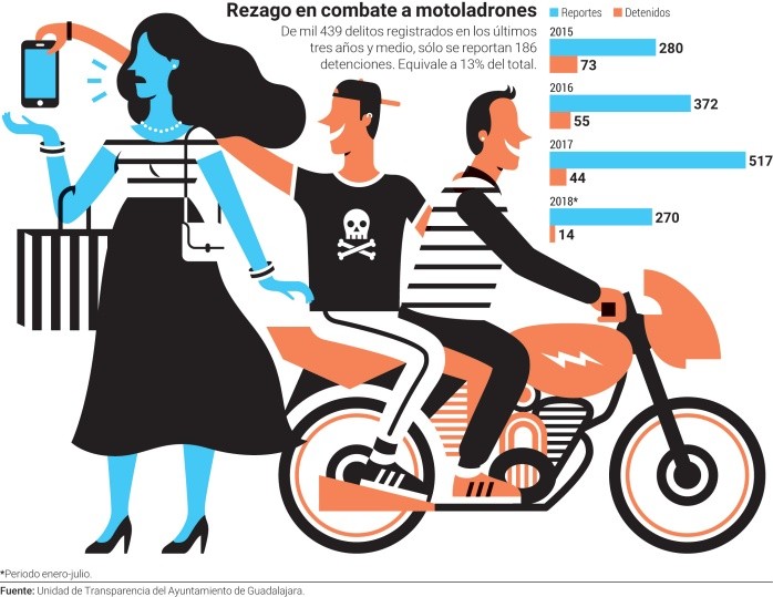 El pasado 29 de agosto, la Policía de Guadalajara detuvo a un hombre armado que, a bordo de una motocicleta, le arrebató 100 mil pesos a un cuentahabiente al que interceptó entre la calle Pedro Moreno y avenida Chapultepec. Es una de las pocas capturas a estos delincuentes en los últimos años.Como respuesta a una solicitud de información, vía Transparencia, la corporación tapatía indicó que entre enero y julio de este año se documentaron 270 reportes de víctimas de estas personas. Sin embargo, los uniformados sólo lograron aprehender a 14: uno por cada 20 robos.En el reporte se agregó que el año pasado se enfrentó una situación similar. Hubo 517 hechos de este tipo y únicamente 44 retenidos.En Zapopan, la Comisaría destacó que desde 2016 tomó nota de 265 ilícitos en contra de personas, cuentahabientes, negocios, vehículos, taxistas, motociclistas, repartidores y transporte público, pero sus elementos sólo pudieron someter a 19 ladrones. Entre las colonias en las que más se cometen los atracos están Las Águilas, Tabachines, Jardines Universidad, Constitución, Paseos del Sol y la Cabecera Municipal.En el caso de Tlaquepaque, se informó por escrito que el último detenido se registró en marzo de 2016. Desde esa fecha no ha habido aprehensiones, a pesar de que en 2017 las autoridades de este municipio reconocieron, a través de un informe, que en los horarios de salida y entrada de la escuela y del trabajo las principales víctimas eran las mujeres, y que entre los perímetros que más afectaciones tenían estaban el Centro, Jardines de la Paz, San Martín de la Flores, Camichines, Residencial La Soledad, Rancho Blanco, San Pedrito, El Tapatío, Las Liebres y Fraccionamiento Revolución.Con respecto a Tlajomulco, la Policía municipal entregó un informe en el que señaló 80 hechos en los primeros nueve meses del año, pero acentuó que sus oficiales sólo detuvieron a seis responsables.Fuente: Policía de Guadalajara.*Entre enero de 2015 y julio de 2018. Los motoladrones de la metrópoli prefieren el horario de oficina para delinquir.Por ejemplo, en el Centro tapatío, una de sus colonias favoritas en los últimos tres años, seis de cada 10 reportes registrados por la Policía de Guadalajara llegaron entre las 10:00 y las 18:00 horas.Fabricio, una de sus víctimas, cuenta que lo sorprendieron a la altura de la escultura “Árbol Adentro”, de José Fors, que se encuentra en el Paseo Fray Antonio Alcalde. El episodio sucedió en julio, antes de que en redes sociales se difundiera un video en el que se evidenció la facilidad con la que operan y la actual administración tomara la decisión de que un uniformado vigile el lugar las 24 horas.Eran las 15:00 horas cuando Fabricio escuchó el sonido de una motocicleta y luego sintió un golpe en las costillas. No sabe si fue un puñetazo o el impacto del retrovisor. Sólo recuerda que no había terminado de escribir un mensaje cuando dos hombres le arrebataron el celular y escaparon por la calle Juan Manuel. Él corrió hacia el Palacio municipal y pidió ayuda. Luego intentó alcanzarlos para recuperar el aparato, pero se esfumaron.En Zapopan se observa una estadística similar, pero allí la mayoría de los llamados a la autoridad que se documentaron desde 2017 se dieron entre las 12:00 y las 14:00 horas. Entre los espacios predilectos para llevar a cabo esta actividad delictiva están la cabecera municipal, Paseos del Sol, Constitución y Arboledas.En Tlaquepaque, nueve de cada 10 llamados de auxilio en este año se hicieron de lunes a viernes. Sin embargo, a pesar de que en julio de 2017 este medio de comunicación publicó que la Comisaría reconoció que las personas que roban y escapan a bordo de una moto aprovechan los horarios de entrada y de salida de la escuela y del trabajo para asaltar a las mujeres (80% de sus víctimas), desde marzo de 2016 la dependencia no ha capturado a ninguna.La Policía de Tlajomulco, que no compartió datos de detenidos por esta práctica, indicó el crecimiento de este ilícito. Por escrito, destacó que si bien en 2017 hubo 26 hurtos, en lo que va de 2018 suman 80. Los sitios más “visitados” son San Sebastián El Grande, Zapote del Valle, San José del Valle y Santa Cruz del Valle.En el caso de Tonalá, a mediados del año pasado aceptó que Loma Dorada y el Centro estaban entre los puntos que más enfrentaban este problema.Rosalía estaba en la colonia La Perla cuando fue víctima de unos motoladrones.“Iba caminando y saqué el celular para contestar una llamada. Un hombre pasó junto a mí. Yo me hice a un lado para darle el paso y en eso me lo arrebató. Todavía se dio la vuelta para burlarse. Yo quise correr tras él, pero me dio miedo. En eso pasó un motociclista y yo le grité que me ayudara. Más adelante vi que se detuvo y subió (al vehículo) el que me lo había quitado”.De acuerdo con la Comisaría tapatía, entre las colonias favoritas en las que operan estos delincuentes desde 2015 están el Centro, San Antonio y La Perla. En ellas se registraron 71, 40 y 26 reportes, respectivamente, de ciudadanos afectados.A la par de La Perla se encuentra Santa Tere, con el mismo número de llamados.El mes pasado, el comisario en jefe de la Policía de Guadalajara, Mario Alberto Martínez, señaló que se realizaron capturas en las cercanías de la Catedral y se estableció que también atracan en el corredor Juárez-Javier Mina, las inmediaciones de la Calzada Independencia y calles cercanas al mercado San Juan de Dios. LA VOZ DEL EXPERTOGabriel Mercado Barrera (académico de la Universidad de Guadalajara)El miembro del cuerpo docente del Sistema de Universidad Virtual (SUV) de la Universidad de Guadalajara (UdeG) destacó que tras los exiguos resultados en la detención de motoladrones que operan en la Zona Metropolitana de Guadalajara (ZMG), es importante que se cambie la estrategia de reacción por una de prevención.“La estrategia de nuestras autoridades p