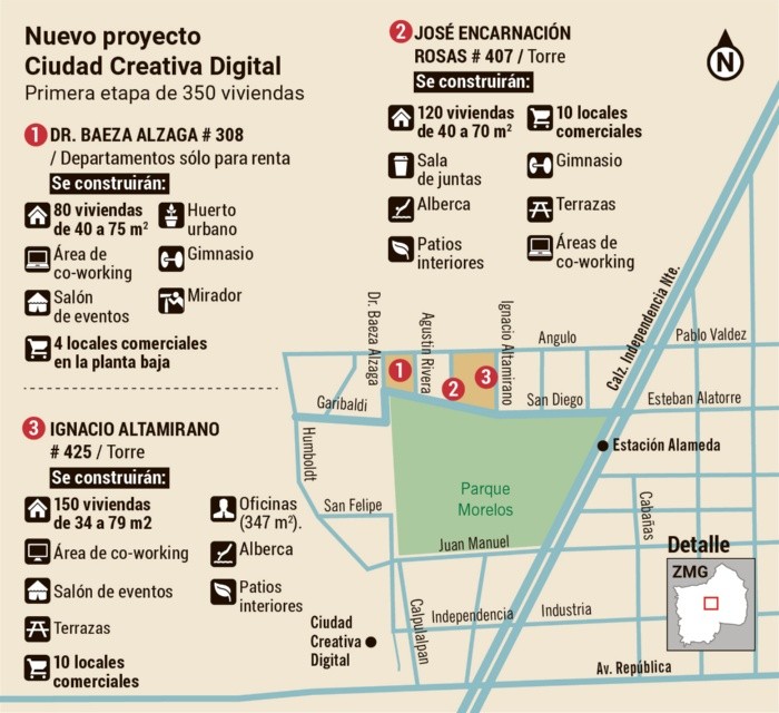 El plan de repoblamiento y recuperación del Centro Histórico de Guadalajara, impulsado por el Ayuntamiento, incluye costos de vivienda más económica. Un ejemplo es el Distrito Creativo Guadalajara, proyecto que ya comenzó con la construcción de tres de los cuatro edificios que lo compondrán. La primera etapa tendrá alrededor de 350 departamentos en las inmediaciones del Parque Morelos, con un precio de venta de 1.5 millones a dos millones de pesos.Los costos de estas viviendas se encuentran por debajo de la mediana del “Precio promedio de viviendas en venta por colonia en el Área Metropolitana de Guadalajara”, que reporta el Instituto de Información Estadística y Geográfica (IIEG) de Jalisco, que promedian los dos millones 295 mil pesos. Incluso, los nuevos espacios tendrán un precio promedio más bajo que el reportado en distintas páginas y plataformas de venta de inmuebles, que es de dos millones 530 mil pesos, según una búsqueda electrónica.Destaca que el plan en los alrededores del Parque Morelos es uno de los cuatro polígonos de la Zona Centro identificados por el Ayuntamiento como puntos estratégicos para repoblar la ciudad, en los cuales se contemplan las zonas de La Normal, Agua Azul y Mexicaltzingo, donde también habrá departamentos con costos desde los 800 mil pesos, gracias a los subsidios otorgados por la alcaldía.“El Gobierno debe entrar a subsidiar ciertas cuestiones para vivienda asequible. El costo de la tierra en la metrópoli es altísimo… y muy específico en el Centro de la ciudad. Nosotros estamos obligando a que los desarrolladores tengan cuando menos el 20% de su edificio con vivienda asequible; es decir, departamentos de hasta 800 mil pesos”, explicó el alcalde tapatío, Pablo Lemus, durante su participación en la Cumbre Internacional del Hábitat de América Latina y el Caribe 2022. De acuerdo con el último Censo de Población y Vivienda del Instituto Nacional de Estadística y Geografía (Inegi), Guadalajara perdió cerca de 110 mil habitantes en los últimos 10 años (migraron a otros municipios de la zona metropolitana). Se pretende revertir ese despoblamiento.En el año 2024 estaría lista la construcción del Distrito Creativo en Guadalajara, que comprende cuatro complejos de viviendas en las inmediaciones del Parque Morelos, informa Antonio Salazar Gómez, director de la Agencia para el Desarrollo de Industrias Creativas y Digitales de Jalisco.“Están terminando el tema de licencias y tienen que arrancar ya este año con los proyectos, de acuerdo con la licitación deberían estar listos para el primer trimestre de 2024”.Las autoridades informaron que esta semana comenzaron la edificación de los primeros desarrollos de vivienda y uso mixto para detonar la zona del parque Morelos. Se construirán un total de 350 viviendas en los tres predios que fueron adjudicados en meses pasados: un edificio contará con 80 departamentos sólo para renta, otra torre tendrá 120 unidades y una tercera ofertará 150. Estas últimas serán para vender y arrendar. También se lanzará la licitación del terreno D del Distrito Creativo, que es el cuarto predio en donde también se podrá construir vivienda. Luis Cisneros, regidor tapatío, comentó que estos proyectos de vivienda tendrán “departamentos accesibles para la clase media y para las personas que son atraídas por este sector creativo, para que pueda detonarse una demanda de servicios gastronómicos y culturales”.El edil promovió también que las vías comerciales ubicadas en torno a Ciudad Creativa Digital (CCD) se consideraran entre los nuevos corredores gastronómicos del municipio. Para los siguientes tres años se analiza la construcción de la torre B del primer complejo, pues los dos primeros edificios ya se encuentran ocupados al 100 por ciento.Salazar Gómez declaró que se tienen empresas en lista de espera para instalarse en este complejo, entre éstas, una universidad privada.“Creemos que si se inicia en 2023, sería una buena decisión dejar espacio para todas estas empresas que seguirán llegando en los siguientes cuatros años, que es el periodo que creemos podría llenarse esta torre”.El director de la Agencia agregó que todavía queda reserva territorial para un futuro. Por ejemplo, en el predio donde actualmente está ubicada la Secretaría de Salud se proyecta la construcción del segundo complejo creativo, por lo que la dependencia será reubicada en otro espacio.El funcionario reconoció que el Plan Maestro de CCD registra un retraso. Se proyecta que la zona se consolide en los próximos 15 a 20 años. “Con la vivienda, con otro complejo creativo, con zona comercial, con estudios de grabación… lo importante es que ya hay muchos interesados”.EL DATODe los 16 predios propiedad del Fideicomiso Maestro de CCD, actualmente sólo tres cuentan con alguna construcción en operación. Hay cinco utilizados como estacionamiento, dos fincas en resguardo, y el resto permanece como lote baldío.Para dotar de equipamiento, capacitación o promoción de proyectos creativos digitales, se lanzó el Fondo de Apoyo a Proyectos de Alto Impacto a la Industria Creativa Digital, que cuenta con una bolsa de cuatro millones de pesos para este 2022.En este año se autorizaron seis proyectos, por ejemplo, uno sobre ciberseguridad y manejo de la información de las industrias creativas, un laboratorio de inteligencia de mercado para las industrias creativas y el desarrollo de contenidos para la formación en animación digital mediante una plataforma educativa, entre otros.El objetivo del fondo es impulsar el desarrollo, la consolidación, la formación de capital humano especializado y la propiedad intelectual en colaboración con las unidades económicas de la industria Creativa Digital de Jalisco.La Agencia informa que se otorgan apoyos económicos para desarrollar proyectos de alto impacto, que les permitan ampliar su cartera de servicios o incursionar en nuevos me