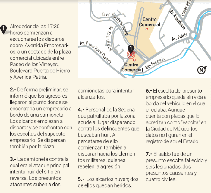 La balacera ocurrida afuera de un centro comercial localizado entre Avenida Empresarios, Paseo de los Virreyes y Boulevard Puerta de Hierro, alrededor de las 17:30 horas de ayer, dejó un muerto y seis heridos, confirmó el gobernador de Jalisco.La autoridad estatal detalló que el fallecido era un supuesto escolta de la persona por la que iban los agresores. De los lesionados cuatro son civiles y los otros dos presuntos causantes del tiroteo. El mandatario indicó en sus redes sociales que se aseguraron automóviles, armas y equipamiento táctico con insignias de un grupo de la delincuencia organizada. El coordinador General Estratégico de Seguridad, Ricardo Sánchez Beruben, destacó que tras recibir el reporte de los balazos se instaló la Comisión Ejecutiva del Consejo Estatal de Seguridad, por lo que el aviso fue atendido por personal de la Secretaría de la Defensa Nacional (Sedena). “Si no hubiera sido de esa manera, estuviéramos contando otra historia”, comentó el funcionario. Por su parte, el fiscal de Jalisco, Luis Joaquín Méndez, afirmó que se desconoce hacia quién iba dirigida la agresión que causó el enfrentamiento. En el punto de la refriega quedaron más de 200 casquillos percutidos. El evento en Zapopan generó alerta entre los comerciantes, clientes y habitantes de la zona. Por ejemplo, Isaac estaba en una tienda departamental cuando escuchó las detonaciones de arma de fuego. “Nos resguardamos en la tienda y cerraron las cortinas. No dejaron salir a nadie hasta que entraron los de seguridad y nos dijeron que todo estaba bien”.Luis estaba por cruzar la calle para dirigirse a la plaza cuando un sonido lo detuvo. “Se escuchó como si fueran los truenos de cuando pasa la Virgen y nos dimos cuenta de que eran balazos. Nos paramos y no sabíamos qué hacer. Fueron más de tres minutos de balazos y descargas. Cada descarga o ráfaga duraba más de 15 segundos. Niños, señoras, familias... todos empezaron a correr hasta que salieron los empleados de un local de café y nos gritaron que nos echáramos al suelo”. Visitantes y vecinos de la zona cuentan cómo vivieron los hechos registrados la tarde de ayer en la ciudad.Carlos acudió a un restaurante ubicado en el centro comercial de Boulevard Puerta de Hierro y Avenida Patria para celebrar con su esposa su aniversario de bodas. Dejó su carro en el valet parking y cuando estaba en el lugar comenzó a ver los videos de la balacera que se registraba afuera y se dio cuenta de que su vehículo salía en ellos.“Mi carro quedó en medio de donde se bajaron las camionetas, el que se ve ahí (en los videos). Lo más seguro es que traiga un balazo, ya le hablé al seguro. Se lo di a los del valet parking y se les bloqueó porque trae un cortacorriente, y ya no me buscaron, es el Audi gris, ya vi en los videos y en el lugar que se enfrentaron veo que está mi carro”, manifestó.Por otro lado, una vecina de una torre de departamentos ubicada en la zona dijo que presenció con angustia el momento en el cual comenzaron las detonaciones. “Sentí muchísimo miedo, un balazo pegó en el edificio de departamentos y se rompió un cristal por un disparo”, acotó la mujer, quien prefirió el anonimato.La mujer señaló que una amiga le marcó por teléfono porque no sabía nada de su hija y estaba muy preocupada. “La mamá está desesperada porque no la dejaban pasar para ver si las veía y ya no las dejaban salir. En domingo mucha gente viene a la plaza a comer y fue terrible, mucha gente corrió y se resguardó en la cafetería. Estaban esperando sus carros y les tocó la balacera”.La Policía de Zapopan informó que la zona se encontraba resguardada, “y recorre todo el polígono de Acueducto, Patria, Puerta de Hierro y Anillo Periférico. Te pedimos mantenerte informado a través de nuestros canales oficiales”. Se le preguntó a la Fiscalía estatal cuánto tiempo estaría resguardada el área, pero hasta el cierre esta edición no se respondió a la cuestión. "Mi carro quedó en medio de donde se bajaron las camionetas, el que se ve ahí (en los videos). Lo más seguro es que traiga un balazo, ya le hablé al seguro"Carlos, comensal de restaurante en zona de Puerta de Hierro Después de las 17:30 horas, Luis estaba por cruzar la calle cuando un sonido lo detuvo. Dice que fueron más de tres minutos de balazos y descargas. Niños, señoras, familias, todos empezaron a correr. Hasta que salieron los empleados del local de café y les gritaron que se agacharan al suelo.“Lo feo es que como ciudadano no sabes qué hacer. Se oían las balas arriba de los vitrales del local de café, fue impresionante, fueron minutos de balazos. Nos quedamos en el estacionamiento. En ese momento, por seguridad, no dejaron salir a nadie”.Luis estaba afuera de la plaza ubicada en Paseo Royal Country y Avenida Patria, e iba rumbo al centro comercial localizado en Paseo Andares y Avenida Patria, donde la tarde de ayer se registró una balacera. Son dos cuadras de distancia a través del Paseo de los Virreyes.Luis y las personas a su alrededor se agacharon, y “gateando” se metieron al estacionamiento del centro comercial. Explica que un muchacho llegó corriendo a refugiarse con ellos. “Nos contó que él estuvo frente al lugar de la balacera y vio cómo las balas rebotaban. Nos pidió un cigarro porque estaba muy nervioso”.Después de varios minutos, dice que los encargados del estacionamiento los dejaron salir. “Fue angustiante, sobre todo porque las personas no sabemos cómo reaccionar a este tipo de eventos. Y también nos sentimos impactados porque nosotros íbamos al punto donde ocurrió todo. Gracias a Dios la gente que vimos estaba bien, asustada, pero bien”.Agrega que las patrullas tardaron como 20 minutos en llegar. “Es muy raro que tardaran tanto. Después de la semejante balacera, solo siguió el silencio, muchos minutos en silencio e incertidumbre, nos veíamos unos a los otros nada más. La Policía ta