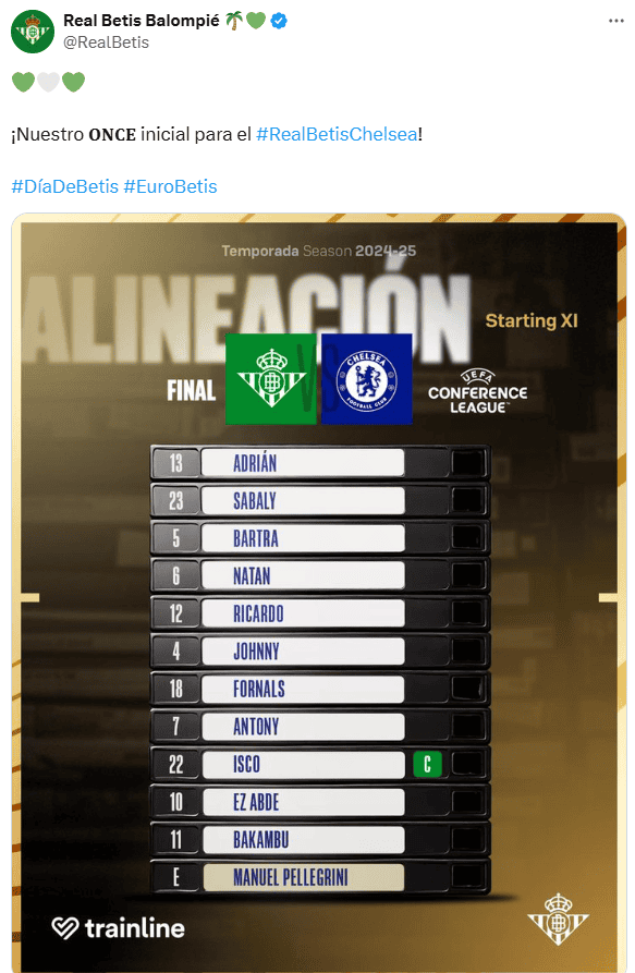 Deportes | Betis vs Chelsea: EN VIVO, final de la Conference League, horario, canales Sigue aquí el minuto a minuto del partido por el título del torneo de Europa Oralia López 28 de mayo de 2025 - 14:54 hs 1 ‒ 4 Termina el partido y Chelsea es campeón de la Conference League El equipo inglés se consolida como el primer equipo en ganar los tres títulos de las competencias europeas, luego de la Champions y Europa League. ¡Goool! Caicedo anota el cuarto al minuto 90+1. Se acerca el título para los Blues. ¡Otro gol! Sancho anota al 83 el tercero para la causa inglesa. ¡Gooool! Jackson pone el segundo al minuto 71 y el Chelsea ya le dio la vuelta al marcador. ¡Goool! Se empata el partido. Enzo Fernández anota al minuto 65 el primer tanto de los azules y se empareja el marcador. Comienza la segunda parte Se juega el segundo tiempo en Bresalvia. Termina el primer tiempo Se acaban los primeros 45 minutos de la final; los equipos regresan al vestidor, la ventaja todavía es para el Betis. 30 minutos de pocas emociones Transcurridos los primeros 30 minutos del partido, el juego se encuentra igualado; aun con la ventaja para el Betis, el Chelsea sigue al frente, sin mucho éxito. ¡Goool! Abde Ezzalzouuli abre el marcador a los 9 minutos; Betis ya va ganando el partido. ¡Arranca el partido! Rueda el balón en Breslavia. Los 11 de cada equipo, listos para el inicio del partido Betis y Chelsea revelan el 11 inicial con el que encararán la primera parte de la final. Temas Real Betis Chelsea Futbol Internacional UEFA conference league final Lee También México sufre la baja de este jugador rumbo a Fecha FIFA Luis Ángel Malagón y su esposa desmienten acusaciones de violencia Lo que se sabe de la supuesta denuncia contra el portero del América ¿Dónde ver EN VIVO la final de la Conference League Betis vs Chelsea?
