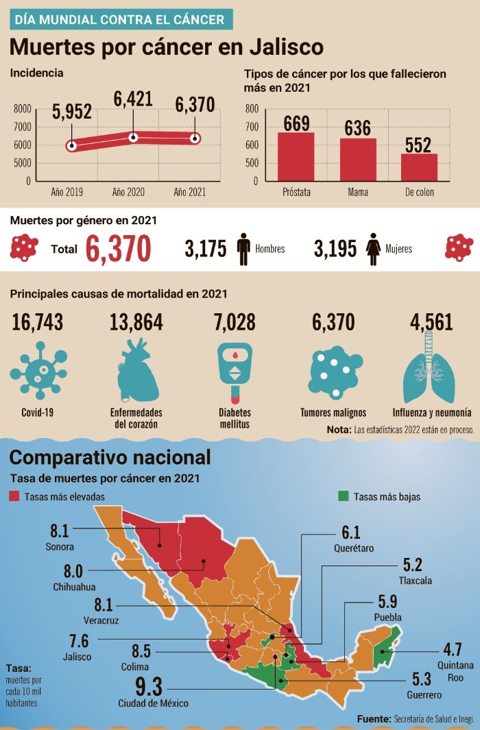 En diciembre de 2015 diagnosticaron con cáncer de mama a Marisela Valdovinos, por lo que empezó con las quimioterapias. Durante un año y tres meses de tratamiento tuvo que seguir las indicaciones médicas al pie de la letra. Recuerda que gracias al Seguro Popular (que desapareció en esta administración) pudo atenderse en un hospital privado sin costo. “Me dieron 25 radiaciones y me hicieron mi cirugía de mama sin ningún costo”. Tuvo que seguir todo un proceso integral porque las quimioterapias le bajaban las defensas. “Lo que sientes con el dengue, lo sientes con cada quimioterapia, pero 10 veces más. Hubo un momento en que abracé mi enfermedad: tenemos que enfrentar esa situación pesada. Pero aprendes a vivir con eso”.Hoy tiene 52 años y es una sobreviviente de la enfermedad.Sin embargo, el cáncer detonó que seis mil 370 fallecieran por tumores en 2021 en Jalisco, principalmente por cáncer de próstata, mama y colon. Eso representa el 8.5% de todas las muertes registradas en el Estado en ese año (74 mil 360). Las estadísticas de 2022 aún están en proceso por parte de la Secretaría de Salud y el Inegi. Marisela pide a las personas que se autoexploren, ya que puede salvarles la vida.En 2021, las cinco principales causas de muerte entre los jaliscienses fueron el COVID-19, enfermedades del corazón, diabetes mellitus, tumores malignos e influenza-neumonía, respectivamente.Mientras hoy se conmemora el Día Mundial contra el Cáncer, la esperanza de vida de las personas con esta enfermedad depende de fomentar acciones preventivas, como mantener hábitos saludables y visitar frecuentemente al médico. Y los principales exámenes que se deben realizar son de cáncer colorrectal, pulmón, mama y cervical.Con apenas cinco años, Herón Figueroa fue diagnosticado con leucemia linfoblástica aguda, lo que provocó angustia y preocupación en su familia. Ahora, a sus 12 años, está por ser dado de alta, cuenta su madre Ana Isabel Plascencia.La mujer explica que el proceso de siete años ha sido complicado para todos pero que han logrado superarlo con amor y con la ayuda de los médicos y las instituciones contra el cáncer. “La familia se unió más, entre todos nos ayudamos, porque a veces eran meses que uno estaba en el hospital. Tiene dos hermanas, una es un año más chica, y otra cuatro años más grande. Siempre le dieron fuerza cuando entraban a visitarlo al piso siete”.Rememora que el menor no tenía síntomas como otros niños, que dicen que se cansan o tienen moretones. Lo que les llevó a descubrir el padecimiento fue que tenía una gripe que no se le quitaba. “Lo llevé al Hospital Civil Viejo, me dijeron que iba muy mal, que le iba a dar un infarto. Le hicieron más exámenes y fue leucemia. Nos dijeron que era casualidad, en la familia no había antecedentes de ningún tipo de cáncer y fue el más pequeño de tres hijos”.Menciona que en ese entonces todavía estaba el Seguro Popular, el cual les cubría las consultas y las quimioterapias. Cuando lo quitaron, les hacían falta medicamentos, los cuales consiguieron en Nariz Roja.“Y desde entonces nos apoyaron. Estudió la primaria en Nariz Roja y ahorita ya entró a la secundaria. Con las quimioterapias se le cayó su pelo pero no se le quitaba el hambre y seguía comiendo. Eso nos decían los doctores que era muy bueno”.El tratamiento iba bien, pero recuerda que hubo momentos de desesperanza. “Aunque digan que son niños normales, no es así. A él no lo podían canalizar porque se le tronaban las venas. Le pusieron un catéter. Él no podía correr y de un golpe se lo quitaron otra vez”.Explica que al menor siempre le dijeron la verdad. “Desde que tenía cinco años le decíamos que tenía que cuidarse con su enfermedad. Hay muchos papás que no quieren decir la palabra cáncer. Entre más afronta uno las cosas es mejor”.A los padres que tienen hijos con cáncer, les recomienda que no se desanimen. “Cuando les digan que su hijo tiene cáncer luchen contra la enfermedad todos juntos, sí se puede salir adelante. Mi hijo ya tiene 12 años”.DATO4 de febreroHoy se celebra el Día Mundial contra el Cáncer.SABR MÁSDe acuerdo con los últimos datos reportados por la Red Nacional de Registros de Cáncer (RNRC), en México se calculan más de 191 mil casos nuevos de cáncer cada año y más de 84 mil muertes por esta enfermedad.Según la organización “Juntos por el Cáncer”, los tipos de cáncer que más muertes ocasionan en nuestro país son el cáncer de pulmón, mama, colorrectal, de próstata y de estómago. Juan Carlos Vázquez, jefe del Servicio de Oncología del Antiguo Hospital Civil de Guadalajara “Fray Antonio Alcalde”, reveló que en los últimos años han ido creciendo las atenciones para tratar el cáncer; en el 2019 tuvieron alrededor de cinco mil consultas, mientras que hasta octubre del 2022, el último corte, llegaron a superar las 14 mil consultas.“De tal manera que en 2022 debimos haber terminado con unas 18 mil consultas. Además, de esas consultas se hacen unas 600 cirugías oncológicas por año de tumores de mama, páncreas, colon, estómago o esófago, entre otras”.El especialista recordó que para tratar el cáncer ofrecen tres especialidades principales: oncología, conformada por médicos que se dedican a quimioterapias, terapias blanco e inmunoterapias; cirugías de tumores y las radiaciones. “Tenemos una sala de quimioterapia ambulatoria que cuenta con 21 sillones especiales para lo de la quimioterapia, todos respaldados con planta de luz con sus bombas de infusión cada sillón, tenemos un sistema de resguardo de medicamentos de red fría y de temperatura ambiente”. Además de que se ofrecen medicamentos a los pacientes.Vázquez indicó que el tratamiento del cáncer depende de las características del tipo, del avance de la enfermedad y del paciente. “Casi todas las enfermedades oncológicas que se detectan en algún órgano en fase tempra