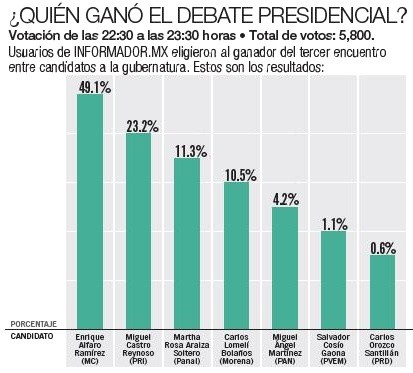 Con la lectura de preguntas formuladas por ciudadanos como principal novedad se realizó el tercer y último debate entre los siete aspirantes a la gubernatura de Jalisco. Aunque el formato tuvo variantes y permitió el planteamiento de cuestionamientos directos que fueron sorteados para cada aspirante, el detalle concreto de propuestas otra vez no llegó en términos generales.La dinámica de ataques y alusiones personales se concentró en el abanderado de la coalición Juntos Haremos Historia, Carlos Lomelí Bolaños.La candidata de Nueva Alianza, Martha Rosa Araiza, abrió fuego y comenzó los señalamientos contra el abanderado de Morena. En una de sus intervenciones, tras acusarlo de vender medicamentos a sobreprecio al Instituto de Pensiones del Estado, le entregó una caja supuestamente de omeprazol comprada 10% más caro. El panista Miguel Ángel Martínez también lanzó dardos contra Lomelí. Afirmó que quien ha hecho negocios con la corrupción no puede combatirla. Y anticipó que presentará otra denuncia contra el aspirante de Morena.Lomelí respondió argumentando que el tema de las presuntas irregularidades en la venta de medicamentos ya fue aclarado por el Pensiones. Al panista Martínez Espinoza lo acusó de enriquecerse del erario y al perredista Carlos Orozco lo señaló de estar ahí sólo porque el líder de la Universidad de Guadalajara, Raúl Padilla, lo impuso. Tras la lluvia de ataques en su contra, Lomelí pidió a los aspirantes serenarse y defendió el aumento de su patrimonio como producto del esfuerzo.El priista Miguel Castro Reynoso destacó por ser quien más propuestas planteó, insistiendo en temas como crear la segunda universidad pública, el programa Jalisco bilingüe y el programa Prepa para todos. Planteó la integración de un observatorio para analizar el trabajo del Poder Judicial y criticó la propuesta de Enrique Alfaro, que ha insistido en la necesidad de una “limpia” en el Poder Judicial. El priista lanzó también críticas contra el emecista por la inseguridad en Guadalajara.Por su parte, Salvador Cosío Gaona, del Partido Verde, insistió en su propuesta de retomar la discusión sobre la aplicación de la pena de muerte, la legalización de la mariguana y crear un nuevo código penal.En el tema de seguridad los aspirantes coincidieron en reforzar la capacitación y coordinación de las fuerzas de seguridad, a la par de aumentar la inversión. En el combate a la corrupción el punto de coincidencia fue fortalecer a la Fiscalía Anticorrupción y darle autonomía completa.La aspirante de Nueva Alianza Martha, Rosa Araiza, cerró su participación pidiendo a los contendientes del PRI, PAN, PRD y del Partido Verde, que declinen en favor de ella. "No voy a usar este debate para atacar a mis adversarios, simplemente diré que mañana a las 12 del día van a conocer ustedes un audio con la voz del señor candidato Lomelí confesando el desfalco que hizo también al Hospital Civil de Guadalajara". Enrique Alfaro (MC)"Primero fue que Hiram (Torres) era mi socio; hoy, que el coordinador de campaña. Mañana será un submarino ruso con medicamentos que voy a estar esperando en Puerto Vallarta". Carlos Lomelí (Juntos Haremos Historia)"Qué lamentable que se hable hoy que Guadalajara es un municipio que está en extraordinarias condiciones, cuando Enrique Alfaro fue el presidente municipal que más privatizó el municipio en la historia moderna". Miguel Castro (PRI)"Votar por ellos es votar por la corrupción. Eres un buen hombre Castro, pero mejor declina por mí y vota por mí. Al resto, Miguel Ángel, Cosío, renuncien también o mejor declinen por mí, porque son paleros". Martha Rosa Araiza (Panal)"En el tema de seguridad, que no le saquen. Si tienen miedo mejor que renuncien. Hay que darle seguimiento porque si son delincuentes hay que ir contra ellos". Salvador Cosío (PVEM)"Me resulta increíble que, quienes han hecho de la corrupción su estilo y su fuente de negocios, hoy vengan a decirnos que con ellos la seguridad estará bien". Miguel Ángel Martínez (PAN)"Nadie en el servicio público se escapa. El cáncer de México y de Jalisco es la corrupción, porque todos le quieren sacar raja al otorgar una compra o una licitación". Carlos Orozco (PRD)“Superficiales en el tema de seguridad” Francisco Jiménez Reynoso (investigador de la Universidad de Guadalajara)Las propuestas en materia de seguridad y gobernabilidad fueron “muy superficiales” por parte de los siete candidatos, frente a los “tremendos y terribles” problemas que hay en la Entidad, como el tema de la escalada y multiplicación de las autodefensas, la autotutela y justicia por propia mano que cada vez es más visible, señaló el investigador de la UdeG.Y para rematar, indicó, se padece el problema del “terrorismo”, que coloquialmente se le conoce como narcobloqueos, el cual se comenzó a presentar en la pasada administración de Emilio González Márquez.Si se toma en cuenta este tipo de problemáticas, insistió, las propuestas realizadas por los candidatos son como del siglo pasado, “como que se quedó estancada la clase política, pues no hacen propuestas dinámicas ni a la altura del problema.Mientras los grupos del crimen organizado van al alza, señaló, el tema de la seguridad se mantiene politizado, “peor aún, se partidizó”.Destacó que los candidatos deben trabajar en serio y consultar a expertos, despolitizar el tema de seguridad, y que se deje de lado la improvisación, el amiguismo y compadrazgo a la hora de elegir a quienes están al frente de las corporaciones de seguridad.Pobres, en el nivel en educación Juan Carlos Silas (coordinador del doctorado en Educación del ITESO)En materia de educación, el nivel de propuestas realizadas por los candidatos fue muy -pobre, “en general fueron lugares comunes… fueron flojos los análisis”, sólo se tuvieron algunos chispazos, consideró Juan Carlos Silas.Reconoció que muchas de las ideas