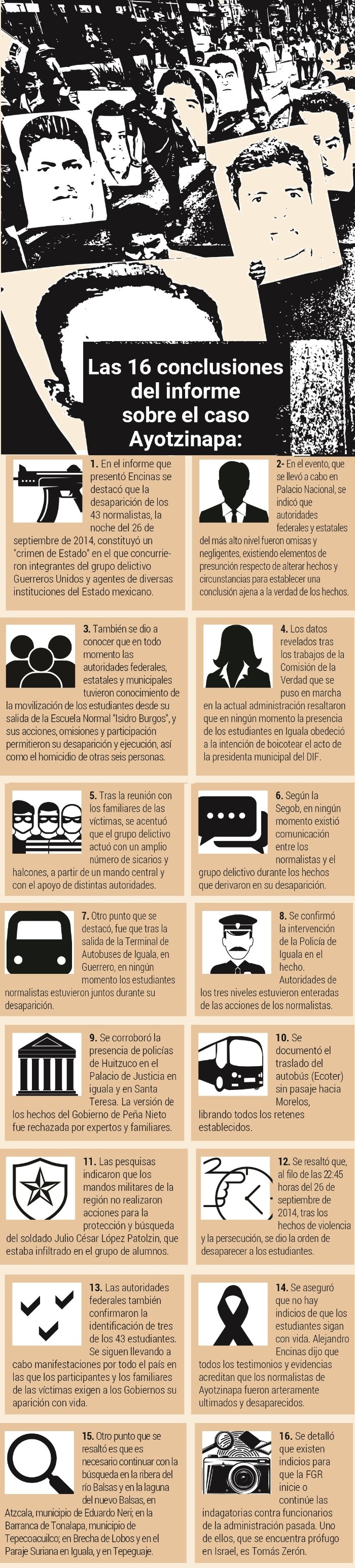 El Ejército tiene responsabilidad en la desaparición de los 43 normalistas de Ayotzinapa en 2014, según un informe que presentó ayer Alejandro Encinas, subsecretario de Derechos Humanos de la Segob. Reveló que la Sedena tenía infiltrado a un soldado para conocer las acciones de los estudiantes de cara a la marcha del 2 de octubre de 2014 y sabía lo que ocurría. Señaló que el militar desapareció, pero sus mandos no hicieron nada para buscarlo.“Sus acciones, omisiones y participación permitieron la desaparición y ejecución de los estudiantes”, dijo.Alejandro Encinas, subsecretario de Derechos Humanos de la Secretaría de Gobernación (Segob), informó que han fallecido o sido ejecutadas 26 personas clave para obtener información sobre el caso de la desaparición de los 43 estudiantes de la Normal Rural de Ayotzinapa, ocurrida en septiembre de 2014.En conferencia de prensa en Palacio Nacional, tras reunirse con los familiares de los normalistas para dar a conocer los avances de la investigación, el funcionario federal detalló que de estas 26 personas, 14 pertenecían a Guerreros Unidos, tres eran familiares de miembros de este grupo delictivo, dos eran integrantes de la organización Gente Nueva, y siete testigos involucrados, entre ellos activistas, funcionarios, policías y gente que proporcionaba información significativa, como es el caso de Mario Casarrubias Salgado, líder de Guerreros Unidos, quien había iniciado un proceso de colaboración con la Comisión de la Verdad creada para esclarecer los hechos.Encinas reveló que no hay indicio alguno de que los 43 estudiantes se encuentren con vida.“No hay indicio alguno de que los estudiantes se encuentran con vida, por el contrario, todos los testimonios y evidencias acreditan que éstos fueron arteramente ultimados y desaparecidos”, dijo.Por otra parte, destacó que ofreció a Tomás Zerón, el más alto exfuncionario involucrado en el caso, un acuerdo para que colabore con la justicia a cambio de información que pueda esclarecer los hechos.Zerón, que se encuentra prófugo en Israel acusado de tortura y desaparición forzada, no aceptó la oferta de inmediato, pero el Gobierno sigue en contacto con sus abogados.Él es considerado el artífice de la versión oficial del Gobierno de Enrique Peña Nieto, que tanto un grupo de expertos internacionales como la actual Fiscalía han demostrado que fue falsa.Encinas subrayó que los nuevos documentos confirman que se trató de un “crimen de Estado”, en el que están involucrados funcionarios de todos los órdenes de Gobierno y que el Ejército es responsable, al menos, de no impedir las desapariciones. Uno de los jóvenes desaparecidos era un soldado infiltrado a quien no buscaron, aunque tenían información en tiempo real de su situación.Encinas informó que existen indicios suficientes para que la Fiscalía General de la República (FGR) inicie o continúe las indagatorias para el deslinde de responsabilidad en contra de 33 personas involucradas en el caso Ayotzinapa -entre ellos funcionarios federales, municipales e integrantes de Guerreros Unidos-, pero reconoció que dentro de estos no está el expresidente Enrique Peña Nieto.A casi ocho años de la desaparición de los 43 normalistas de Ayotzinapa, Aldo Gutiérrez Solano es un sobreviviente olvidado. En aquel ataque, una bala le atravesó la cabeza y lo dejó en cama de forma permanente.Durante el tiroteo en el que un grupo del crimen organizado secuestró a los estudiantes, murieron seis personas: tres estudiantes, una mujer que iba en un taxi, el chofer de un autobús que trasladaba a un equipo de fútbol juvenil y un jugador de 15 años. Pero Aldo vivió, aunque con secuelas de por vida.El anexo siete del Informe de la Presidencia de la Comisión para la Verdad y Acceso a la Justicia del caso Ayotzinapa, correspondiente a la atención a víctimas, no contiene nombres, pero fuentes cercanas detallaron que se trata de Aldo.El reporte señala que el exnormalista recibe atención de la Comisión Ejecutiva de Atención a Víctimas (CEAV) de manera sostenida desde el 29 de junio de 2017, en coordinación con el Gobierno de Guerrero, la Secretaría de Salud federal, la Comisión Nacional de Derechos Humanos (CNDH) y la Secretaría de Gobernación (Segob), a través de un acuerdo “mediante el cual se establecieron compromisos y medidas de ayuda en materia de atención médica y asistencia en favor de dicho joven”.Explica que, “a fin de garantizar en todo momento el derecho a la salud del joven sobreviviente”, la CEAV ha atendido diversos requerimientos de equipamiento médico, como son: cama especial, monitor de tensión arterial y oximetría, aire acondicionado y deshumidificador, aparatos que necesita en su día a día.Además, cuenta con grúa de transporte de su cama al cuarto de terapias, cama ducha, desfibrilador, aspirador y colchón de presión alterna.Además de Aldo, el Gobierno federal ha reconocido que existen víctimas indirectas del caso, quienes han recibido atención en diversas vertientes.Entre ellos destacan 68 familiares de los 43 desaparecidos, que reciben becas para cursar educación básica, media superior y superior en instituciones públicas.También se contabilizan ocho incorporaciones a núcleos familiares ante el Registro Nacional de Víctimas de la CEAV, para el otorgamiento de medidas en materia de alimentación.Ante la CEAV están inscritas 43 víctimas directas y 140 indirectas.De 2018 a la fecha, se han gestionado las medidas de ayuda por conceptos de alimentación y alojamiento a 90 núcleos familiares.Adicionalmente, se ha brindado atención psicológica a 112 personas, además de 228 atenciones médicas.TELÓN DE FONDOEl 24 de septiembre de 2021, el fiscal Omar Gómez Trejo afirmó que las autoridades de la administración anterior incurrieron en tortura y armado de pruebas para construir la llamada “verdad histórica”.Al refutar la antigua versión de la entonce