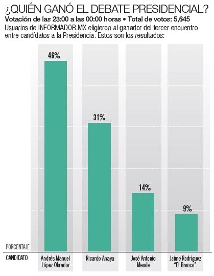Entre descalificaciones, críticas, regaños de los moderadores y hasta la solicitud de un beso, transcurrió el tercer y último debate entre los candidatos a la Presidencia. Aunque el formato acordado consideraba preguntas extraídas de las redes sociales, los aspirantes se brincaron el esquema para confrontarse.El abanderado de la alianza Todos Por México (PRI- Verde-Panal), José Antonio Meade, dedicó los primeros instantes de su participación en desear suerte a la Selección Mexicana de Futbol en el próximo mundial. Lanzadas las buenas vibras, destinó algunos segundos en responder la pregunta que le formularon sobre la brecha salarial que afecta a las mujeres. También aprovechó para cuestionar las propuestas en materia de crecimiento económico planteadas por Andrés Manuel López Obrador (AMLO) y las calificó como una película que ya se vio y que genera desempleo y pobres.Pero López Obrador reviró afirmando que durante todo el periodo neoliberal en el que Meade ha participado en administraciones federales, no hubo crecimiento en el país. “Está muy desesperado Meade, yo no tengo la culpa de que estén ustedes empatados (con Ricardo Anaya), empatados hasta abajo, y piensan que aquí en el debate van a remontar 30 puntos que les llevo. Yo entiendo que estén desesperados, pero serénense”. Ricardo Anaya, de la coalición Por México Al Frente, también enfiló la artillería contra López Obrador. Lo acusó de que mientras fue jefe de Gobierno entregó contratos por 170 millones de pesos, vía adjudicación directa, al empresario José María Rioboó, quien perdió el proyecto de las pistas del nuevo aeropuerto. Pero López Obrador lo negó y respondió que no es corrupto. Tras el cruce de señalamientos, el independiente Jaime Rodríguez “El Bronco” llamó al resto de contendientes a no pelear y darse un beso. “Me divierto con ustedes, ahora dale un beso…ándale… dale un beso. México necesita de la unidad de todos, no de los pleitos”.Anaya y Meade tuvieron su confrontación particular. El panista acusó al ex secretario de Hacienda de estar involucrado en los casos como la red internacional de corrupción de Odebrecht y en la “Estafa Maestra”. Y advirtió que de ganar la Presidencia meterá a la cárcel a Enrique Peña Nieto y a Meade.Sin embargo, Meade contestó que el único candidato indiciado por un delito es Anaya. El abordaje sobre el futuro de la reforma educativa fue otro motivo de confrontación. López Obrador insistió que la suprimirá, aunque se dijo a favor de la evaluación a los maestros “sin persecución”. Por su parte, Meade y Anaya advirtieron efectos negativos con esa medida y recriminaron a AMLO su relación con Elba Esther Gordillo y con la Coordinadora Nacional de Trabajadores de la Educación (CNTE).En la andanada de descalificaciones, Anaya acusó un posible pacto entre Peña Nieto y AMLO. Los presidenciables reiteraron algunas de sus propuestas: López Obrador repitió que combatir la corrupción permitirá ahorros para sacar adelante sus planes. Meade planteó la unificación de los servicios de salud. Jaime Rodríguez presumió que despidiendo a funcionarios flojos podría lograr ahorros por 12 mil millones de pesos. Mientras que Anaya anunció una serie de programas y políticas que tendrían como resultado la entrega de teléfonos celulares, tabletas, insulina y hasta paneles solares para ahorrar energía.El regaño de la noche se lo llevó Jaime Rodríguez, reprendido por la moderadora Gabriela Warkentin por sacar un celular durante el debate. Los aspirantes presidenciales cerraron su participación con un minuto para conclusiones, que aprovecharon para pedir el voto.“Me han atacado tanto porque he dicho con toda claridad que, cuando sea Presidente, sí los voy a llevar ante la justicia. No van a quedar sin castigo casos como Ayotzinapa, la ‘Casa Blanca’, Odebrecht, la ‘Estafa Maestra’. Meade y Enrique Peña Nieto van a enfrentar la justicia”. Ricardo Anaya“Voy a cancelar la esencia de la reforma educativa porque es una mal llamada reforma. Lo que se aprobó tiene que ver más con una reforma laboral, su mecanismo es una represión, una coerción a los maestros… está dedicada a afectarlos y tiene una orientación neoliberal privatizadora”. Andrés Manuel López Obrador“Si queremos crecer, tenemos que cerrar algunas brechas. Una de las más importantes es la brecha entre el hombre y la mujer, la inclusión de la mujer en las alternativas productivas. Podríamos crecer medio punto del PIB más si cerramos esa brecha”. José Antonio Meade“Lo que propongo no es eliminar el salario mínimo sino incrementar el ingreso básico a 350 pesos diarios, a partir de no cobrar el Impuesto Sobre la Renta a quienes ganen hasta 12 mil 500 pesos mensuales. Eso incrementará el ingreso básico”. Jaime Rodríguez “El Bronco”Aunque “El Bronco” fue el que mayor número de ataques realizó, las acusaciones más fuertes se dieron entre Meade, Anaya y López Obrador. Quienes realizaron más propuestas fueron “El Bronco” y Anaya.El más atacado: Andrés Manuel López Obrador (25) Quien más atacó: Jaime Rodríguez “El Bronco” (17)Propuestas por candidato:Jaime Rodríguez “El Bronco”: 23 José Antonio Meade: 17 Andrés Manuel López Obrador: 14Ricardo Anaya: 22