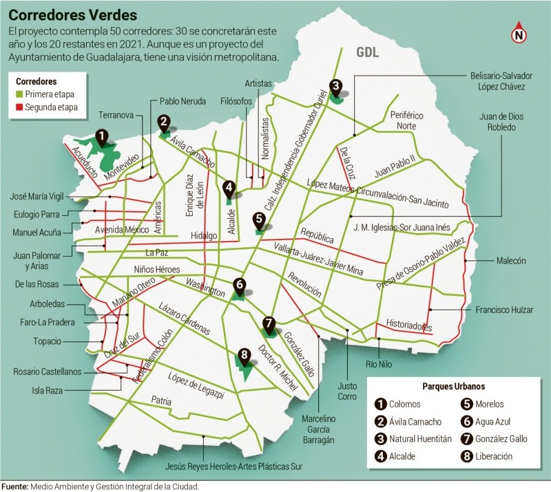 En lo que resta de la administración, el Ayuntamiento de Guadalajara reforestará 50 corredores verdes en la ciudad. El objetivo es conectar a través del arbolado los bosques, parques, ciclovías y camellones ubicados en las principales avenidas. En este año se desarrollará una primera etapa, en la que se intervendrán 30 corredores a lo largo de 159 kilómetros, con la plantación de nueve mil árboles. Las obras están en marcha. Y la segunda fase será el próximo año, con la siembra de hasta 10 mil ejemplares en 20 ejes viales. “Es un programa que se sustenta con el compromiso de Guadalajara dentro de la Red de megaciudades C40 (Grupo de Liderazgo Climático), con la intención de cumplir el Acuerdo de París. Se pretende que en el 2050 podamos, cuando menos, llegar a ser una ciudad neutra en emisiones de carbono”, dice el alcalde Ismael del Toro. Recuerda que la meta de reforestación de este año es plantar 18 mil árboles en total, que se suman a los 15 mil del año pasado. Y se espera que en 2021 se siembren más de 15 mil unidades. Paulina Cervantes Flores, directora de Medio Ambiente, explica que cuando las áreas verdes no están conectadas provocan una reducción de la biodiversidad. “Lo que estamos haciendo con el Programa de Corredores Verdes es conectándolos para garantizar los procesos ecológicos y evolutivos de las especies en la ciudad”.La primera etapa contempla a Periférico Norte, Ávila Camacho, Lázaro Cárdenas, López Mateos, Alcalde, Patria, Américas, Revolución y Vallarta-Juárez, entre otras avenidas. Esta última es la de mayor extensión, con 13.79 kilómetros que serán intervenidos. El programa de reforestación de 50 corredores urbanos en Guadalajara contempla vialidades que permitan facilitar el desplazamiento en medios de transporte no motorizados, como son las ciclovías en operación y emergentes, así como aquellas donde se tienen carriles preferenciales para ciclistas. De las 30 vías que se intervendrán en este año, en 10 avenidas se cuenta con ciclovías: Periférico Norte, Ávila Camacho, Avenida México y Alcalde, entre otras. “El corredor que tenemos de Paseo Alcalde es un corredor completo. Tenemos infraestructura ciclista, iluminación peatonal y sólo falta reforzar en algunos espacios con el tema de arborización”, informa la directora de Medio Ambiente de Guadalajara, Paulina Cervantes Flores. En febrero pasado, cuando se reactivó el espacio, se destacó que este corredor peatonal y ciclista, con 2.5 kilómetros de extensión, es uno de los más grandes de México. Otro ejemplo está en la Avenida Reyes Heroles. “En ese ya se plantaron los árboles a finales de 2019. En ese también se cuenta con infraestructura ciclista, con arborización”. Este medio publicó que de los 123 kilómetros de ciclovías que conforman la red de la metrópoli, 36.24 kilómetros corresponden a Guadalajara. Las ciclopistas se ubican, principalmente, en las avenidas consideradas en este programa de reforestación, como Federalismo, Washington, La Paz, López Cotilla y Agustín Yáñez. Y este año se sumarán otros 28.34 kilómetros.El programa incluye algunas vialidades en donde se llevará la sustitución de lámparas públicas, a través de la primera fase del plan piloto de iluminación peatonal en el que se invertirán 135 millones de pesos. Este último contempla la poda de árboles para que se conviertan en espacios públicos más seguros. Debido a que en Guadalajara hay “espacios muertos” en algunos corredores de la ciudad, incluso, donde anteriormente existían áreas verdes, el Ayuntamiento tapatío inició un proyecto para identificarlos y reforestarlos. “Entraremos a reforzar también la Avenida Terranova, donde podemos ver que hay espacios que se han ido ganando por parte de los comercios. Lo que estamos haciendo es una plantación porque vamos de espacio en espacio, ubicando dónde están los lugares que pueden ser convertidos en espacios para árboles y que no son ni un lugar para el automóvil”, señala la directora de Medio Ambiente de Guadalajara, Paulina Cervantes Flores. Reporta que se cuenta con la cuadrilla Guadalajara Verde, que es la responsable de buscar estos lugares potenciales. “Y entramos de la mano para hacer cajetes nuevos y plantar los árboles… también invitamos al comercio a que los adopten. Es una invitación a que ellos los cuiden y hagamos un trabajo conjunto”. El alcalde Ismael del Toro subraya que éstas y otras acciones forman parte del Programa Guadalajara Ciudad Fresca, que pretende eliminar las manchas de calor con reforestación y cambiar el material con el que se ponen los impermeabilizantes en las azoteas para que en lugar de rojo sea de color blanco. A las acciones de reforestación que realiza el Ayuntamiento tapatío se sumarán los cuatro mil árboles que serán compensados por el desarrollo de las obras públicas en el municipio. El principal proyecto es el Peribús. De acuerdo con las autoridades metropolitanas, esta obra afectará cuatro mil 851 árboles ubicados en una longitud de 42.02 kilómetros, que comprenderán este corredor de transporte público masivo, por lo que se estima que al concluirlo se sembrarán 14 mil 553 ejemplares. El proyecto abarca también a los municipios de Zapopan y Tonalá, por lo que no todos los árboles se plantarán en Guadalajara. Y las acciones de reposición no concluirán este año. El alcalde de Guadalajara, Ismael del Toro, subraya que los planes de obras públicas deben priorizar la reforestación a través de la sustitución de los árboles que son retirados. “La obra pública es uno de los principios en el manejo del arbolado del municipio. El programa de licencias y permisos también tiene como eje rector el manejo del arbolado. En suma, tratamos de canalizar que todos los usuarios particulares, privados y públicos vayan en esta línea de la agenda del Acuerdo de París (COP21)”. Este último tiene como objetivo principal