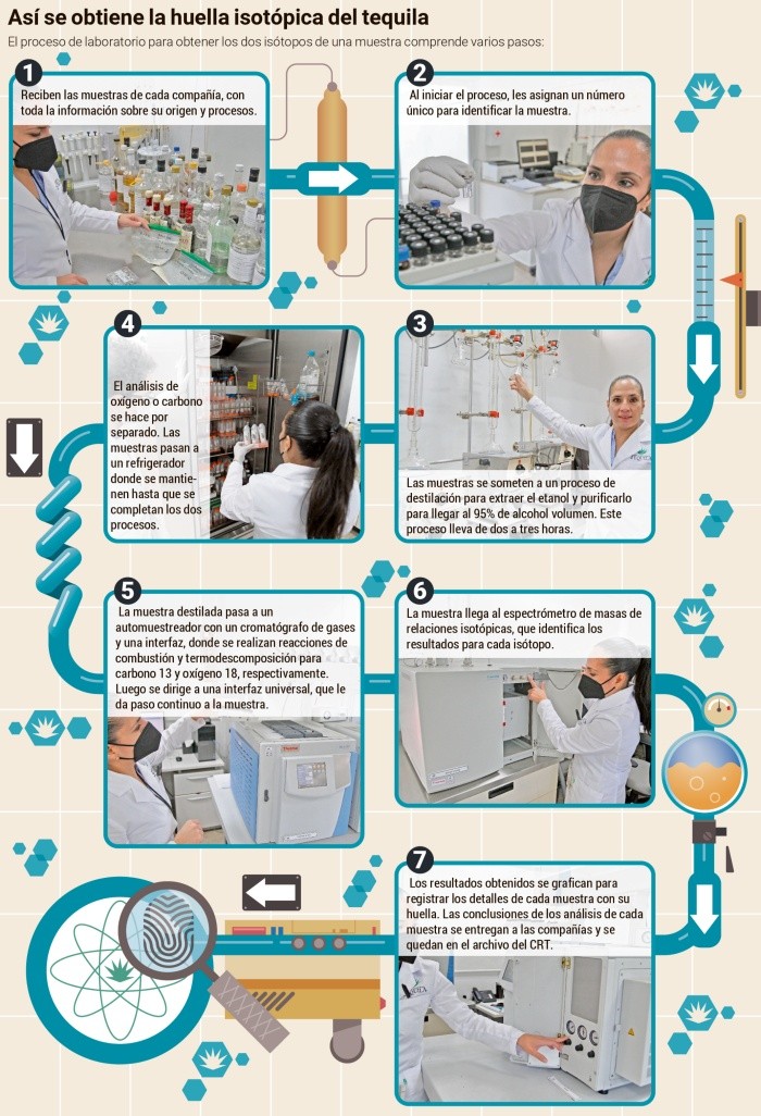Como parte de las acciones para garantizar la autenticidad y prevenir la competencia desleal, el laboratorio de isotopía del Consejo Regulador del Tequila (CRT) trabaja en la construcción de la huella isotópica del tequila, que analiza a nivel atómico las características de la bebida destilada del Agave tequilana Weber variedad azul.Rocío Fonseca Aguiñaga, responsable del laboratorio del CRT, explica que la construcción de la huella isotópica de una marca de tequila es algo similar a la “huella digital” que identifica a una persona y es única.“Estamos trabajando en la construcción de la huella isotópica del tequila, es algo así como la huella dactilar, pero con isótopos; es decir, los átomos de un elemento que tienen diferente configuración en su núcleo. Estamos en la creación del banco isotópico del tequila para evitar cualquier competencia desleal. Cada marca tendrá una huella diferente, con los análisis podemos identificar el origen y el proceso de cada alcohol obtenido de la muestra”.La especialista detalla que determinan dos isótopos: el carbono 13 y oxígeno 18. En el caso del carbono ofrece información sobre el origen de la materia prima; por ejemplo, si utilizaron uva, caña de azúcar, maíz o agave. Con este análisis han logrado identificar las diferencias entre un tequila blanco y uno añejo.El laboratorio isotópico del CRT es el único de su tipo en el país y realiza los mismos análisis en materia de autenticidad que se usan en Europa en bebidas como whisky, champagne, coñac y en vinos con denominación de origen. La huella isotópica se actualiza anualmente. Desde el año 2016, cuando inició operaciones, el laboratorio de isotopía del Consejo Regulador del Tequila (CRT) ha analizado mil 393 muestras de marcas de tequila de 133 compañías para obtener su huella isotópica y desmenuzar las características de cada producto, como un mecanismo auxiliar en la autenticidad.“El agave es un ser vivo que está expuesto al medio ambiente, si cambia, también modifica su huella isotópica. Además, la industria es muy versátil y está actualizando sus procesos de producción, lo que genera relaciones isotópicas diferentes y se tiene que ir modificando”, explica Rocío Fonseca Aguiñaga, responsable del laboratorio.La especialista indica que, además de los fines científicos, el análisis de las diferentes marcas de tequila ha sido útil para algunas empresas como elementos para complementar su autenticidad e ingresar a nuevos mercados.“Las compañías lo han usado como una herramienta auxiliar en materia de autenticidad”. "Estamos trabajando en la construcción de la huella isotópica del tequila… es como la huella dactilar, pero con isótopos, para evitar cualquier competencia desleal"Rocío Fonseca Aguiñaga, responsable del laboratorio del CRTCon la intención de conservar el patrimonio y la tradición de algunos productos fueron creadas las denominaciones de origen en México, contempladas en la Ley de Propiedad Industrial. El Consejo Regulador del Tequila (CRT) explica que este distintivo sirve para identificar un producto como originario de una región o una localidad del territorio nacional, con la intención de avalar su calidad y las características imputables al origen donde se produce.Por eso el tequila es un ejemplo de crecimiento, gracias al trabajo que se tiene en el cuidado de la denominación de origen.Un producto con denominación de origen queda registrado ante el Instituto Mexicano de la Propiedad Industrial (IMPI). Eso implica que es exclusivo del lugar donde se elabora y sus características. Debe cuidarse que no existan imitaciones o que sus elementos sean falsificados.Actualmente, en México hay 18 denominaciones de origen y Jalisco cuenta con tres.Para obtener una denominación de origen tiene que haber una declaración emitida por el IMPI donde se reconozca. Luego se debe elaborar una norma oficial que especifique todas las características que debe cumplir el producto que tiene el reconocimiento. Además, debe contar con un Consejo Regulador que certifique, verifique y pruebe que el producto realmente cumple con lo indicado en la norma y la declaratoria.La denominación de origen del tequila se emitió en 1974.Dos décadas después, la producción oscilaba entre 80 millones y 90 millones de litros, pues no se supervisaba el cumplimiento de la norma.La conformación del Consejo Regulador del Tequila fue un detonador. En su arranque había 22 empresas tequileras y unas 300 marcas. Hoy existen 172 empresas y mil 900 marcas.El año pasado, la producción fue de 527 millones de litros. En los 28 años de operación del Consejo Regulador del Tequila, la exportación creció de 40 millones a 338 millones de litros. La autenticidad del tequila se establece a través de una inspección permanente realizada por el Consejo Regulador del Tequila en las empresas productoras, constatando al 100% el proceso de producción.La supervisión se complementa con el análisis isotópico de carbono 13 y oxígeno 18.Los isótopos son átomos de un mismo elemento, que en su núcleo contienen el mismo número de protones, pero diferente número de neutrones.La proporción de isótopos de carbono 13 para el caso de los alcoholes es típica de su origen vegetal.Las pruebas de isótopos de carbono 13 permiten obtener información sobre el origen de la materia prima; por ejemplo, si utilizó uva, caña de azúcar, maíz o en su caso agave, que es lo que aplica en el caso del tequila.Los isótopos de oxígeno 18 dan información acerca del proceso de producción, pueden dar rasgos de la región donde se produjo el tequila y el proceso de maduración.El proyecto “Banco isotópico del Tequila” fue aprobado en 2014 por la Secretaría de Agricultura y Desarrollo Rural. En 2016, el Laboratorio de Isotopía del CRT inició operaciones.Las actividades que se realizan en el laboratorio de isotopía del CRT son una herramienta complementaria a