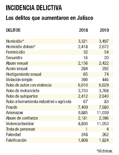 Durante el primer año de la presente administración estatal, en Jalisco aumentaron 18 delitos del fuero común, de 41 modalidades y subtipos que reporta la Fiscalía al Secretariado Ejecutivo del Sistema Nacional de Seguridad Pública. Por ejemplo, en 2018 se registraron dos mil 418 víctimas de homicidio doloso, frente a los dos mil 672 asesinatos del año pasado. Las carpetas de investigación que se incrementaron fueron: desaparecidos, violación, abuso sexual, trata de personas, robos con violencia, fraudes, falsificación, amenazas y violencia familiar, entre otras.El principal responsable de la Coordinación Estratégica de Seguridad de Jalisco, Macedonio Tamez Guajardo, así responde a la violencia y el aumento de esos delitos: “Así es… y lo reconocemos de igual manera. El mundo delictivo es migrante, cambia de región geográfica. Sí reconocemos un rezago en materia de homicidios y desaparición de personas; un rezago que se va abatiendo…”. Raúl Rosales, de la organización Causa en Común, señala que los datos reportados por las autoridades de todas las Entidades son aproximaciones, debido a los delitos no denunciados y a fallas en los registros o por cuestiones tal vez “políticas o de corrupción”, pues en algunas ocasiones se le exige al personal “que disminuyan los números”, cuando en realidad los hechos delictivos van al alza. Según un análisis de esa organización sobre delitos reportados al Sistema Nacional de Seguridad Pública, los de mayor subregistro son: feminicidio, extorsión, secuestro y robo. “Sobre el robo, la Encuesta Nacional de Victimización y Percepción sobre Seguridad Pública señala que la cifra negra del asalto en calle o transporte público fue de 94.7%. Y del robo en casa habitación, de 89.1%”, se expone. En 2019, en Jalisco se abrieron 156 mil 653 carpetas de investigación. Son seis mil 103 menos a 2018, que obedece, principalmente, a la reducción en la mayoría de los delitos patrimoniales.Algunos de los delitos que aumentaron en Jalisco(*) Víctimas.Los asesinatos, los desaparecidos y las fosas clandestinas convergen en el incremento de la violencia en JaliscoEl pasado 30 de diciembre, en la Colonia 5 de Mayo de Guadalajara, un hombre de 30 años perdió la vida luego de ser agredido con un arma de fuego, tras discutir con dos personas. Hasta la tarde de ese día se habían reportado cinco asesinatos. Durante el año pasado, en Jalisco se registró un promedio de nueve víctimas de homicidios al día. En total se cometieron tres mil 497, de los cuales, dos mil 672 fueron dolosos, lo que significó un nuevo récord de asesinatos. Mientras éstos aumentaron, las sentencias condenatorias por este delito disminuyeron en los últimos cinco años. Por ejemplo, en 2015 se dictaron 460 sentencias condenatorias en el primer partido judicial (área metropolitana), especializados foráneos y mixtos, y durante el año pasado se emitieron 337, según datos del Consejo de la Judicatura. En el estudio “Impunidad en homicidio doloso en México: Reporte 2019” se da cuenta de la baja capacidad de investigación criminal. Además de la falta de elementos y equipamiento para investigar, se encuentran los asesinatos del personal que labora en esas áreas. “En Jalisco, en ocho años dos titulares del área de investigación de homicidios fueron asesinados, lo mismo que cuatro agentes del Ministerio Público, en tanto que otro agente desapareció en 2017. De esta forma, un área que presentaba 41% de impunidad (en este delito) en 2008 pasó a 88.5% en 2018”.María Novoa, coordinadora del Programa de Justicia en la asociación México Evalúa, recuerda que hay un déficit de recursos y capacidades en las fiscalías estatales. Subraya que la saturación de los elementos de los Ministerios Públicos es uno de los principales problemas. De los casos, dice, puede haber desde el robo de celular hasta homicidios. Por ello, destaca que están planteando a las autoridades que se tenga una mejor gestión de los recursos. “Deben priorizar en aquellos delitos que tienen mayor impacto en la sociedad”. En el caso de Jalisco, acentúa, deberían enfocarse en resolver los temas más complejos, como es el homicidio, y dar salida distinta al resto de delitos menores. Alfonso Partida Caballero, integrante del Observatorio de Seguridad y Justicia de la Universidad de Guadalajara (UdeG), declara que el homicidio es de los delitos que tienen menos sentenciados. Explica que las carpetas de judicialización se ven afectadas por las detenciones ilegales. “El problema aquí es la falta de investigación de los crímenes”. Tras destacar que han bajado los delitos patrimoniales durante el primer año de la actual administración estatal, el titular de la Coordinación General Estratégica de Seguridad, Macedonio Tamez Guajardo, reconoce que se tienen rezagos en delitos violentos. Con el objetivo de reducir los homicidios y desapariciones, insiste en que la Federación debe brindar apoyo a la Entidad en este tipo de delitos. “Porque la gran mayoría de homicidios y desaparición de personas está vinculada al crimen organizado, el cual es un tema del orden federal”. —¿Qué le respondió el Gobierno federal?—No han dicho que no, simplemente estamos esperando su presencia de actividad contundente en contra de esos delitos. Mientras tanto en Jalisco hacemos lo que está en nuestras manos, con los recursos que tenemos. Anuar García, presidente de la organización México SOS Capítulo Jalisco, recuerda que las autoridades locales no pueden deslindarse del problema de homicidios y desaparecidos. Considera que el discurso de que estos delitos están relacionados con la delincuencia organizada “ya está muy desgastado”. Remarca que “sabemos que sólo 5% de las víctimas recibe asesoría jurídica por parte de los asesores que tiene el Gobierno para cubrirlos. También sabemos que solamente ocho personas recibieron una reparación del daño de