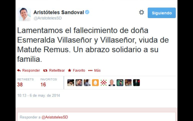 Cultura | A través de twitter, el gobernador confirma el fallecimiento de Esmeralda Villaseñor Aristóteles confirma muerte de viuda de Matute Remus A través de su cuenta de twitter, el gobernador confirma el fallecimiento de Esmeralda Villaseñor Por: EL INFORMADOR 6 de mayo de 2014 - 12:33 hs El mandatario estatal utiliza su red social para anunciar la noticia del deceso. ESPECIAL / GUADALAJARA, JALISCO (06/MAY/2014).- La esposa del célebre ingeniero, Jorge Matute Remus, Esmeralda Villaseñor, falleció este martes. A través de su cuenta de Twitter ( @AristotelesSD), el gobernador Aristóteles Sandoval confirmó la noticia, al tiempo que envió sus condolencias a la familia. "Lamentamos el fallecimiento de doña Esmeralda Villaseñor y Villaseñor, viuda de Matute Remus. Un abrazo solidario a su familia", escribió el mandatario estatal este mediodía en esa red social. También el alcalde de Guadalajara, Ramiro Hernández, lamentó el deceso de la señora. "Que descanse en paz", dijo el primer edil. Hace apenas tres meses (el pasado 17 de febrero), doña Esmeralda acudió al homenaje que prepararon las autoridades para el ingeniero que se encargó de mover de su sitio un edificio entero sin frenar los trabajos que se realizaban en su interior. Se decidió a hablar unos minutos frente a la concurrencia, antes que los restos de su difunto esposo fueran depositados en la Rotonda de los Jaliscienses Ilustres. Frente a políticos y académicos recordó a su marido como un hombre "que sabía lo que era la línea recta y también la rectitud". Ese mismo día, el alcalde tapatío, Ramiro Hernández García, le entregó una bandera con el escudo de Guadalajara. En diciembre, la viuda de Matute Remus donó al Ayuntamiento la biblioteca "Esmeralda Villaseñor", un acervo de más de ocho mil 200 libros que, de acuerdo con el primer edil, "no sólo nos significa recibir un acervo cultural, sino el acervo de toda una vida". Durante el reconocimiento a su célebre marido, doña Esmeralda recordó los "seis años de noviazgo epistolar" con Matute Remus, a quien calificó como un "hombre increíble". "¿Cómo fue posible que a través de las cartas nos conociéramos tan bien y nos quisiéramos tanto?". EL INFORMADOR / ISAACK DE LOZA Temas Twitter Aristóteles Sandoval Decesos de personalidades Lee También Fallece John Lodge, bajista de The Moody Blues Portada: Dr. José Magaña, embajador de Arkana México Muere Miguel Ángel Russo, entrenador de Boca Juniors Trump castigó a YouTube tras ganar millonaria demanda Recibe las últimas noticias en tu e-mail Todo lo que necesitas saber para comenzar tu día Registrarse implica aceptar los Términos y Condiciones