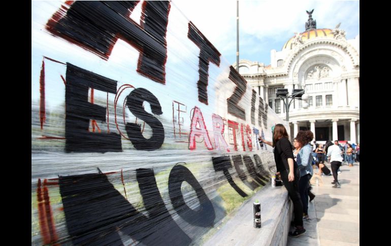 Cultura | La toma político-cultural concluirá hasta mañana sábado a las 6 de la tarde Artistas 'toman' Bellas Artes por caso Ayotzinapa Convocado por el colectivo #Arte43, la toma político-cultural concluirá hasta mañana sábado a las 6 de la tarde Por: SUN 28 de noviembre de 2014 - 17:38 hs En la explanada del Palacio se pueden ver pancartas y mantas con diversas consignas. SUN / E. Orea CIUDAD DE MÉXICO (28/NOV/2014).- El medio día de este viernes, artistas, colectivos, y trabajadores del arte y la cultura tomaron de forma simbólica el Palacio de Bellas Artes para demandar la presentación de los 43 normalistas de Ayotzinapa y exigir la libertad de los 11 detenidos tras la manifestación por este mismo caso del pasado 20 de noviembre en el Zócalo capitalino. Convocado por el colectivo #Arte43, la toma político-cultural se llevará a cabo durante toda la tarde de este viernes y concluirá hasta mañana sábado a las 6 de la tarde. Las actividades comenzaron desde hace unas horas en la explanada del Palacio, donde los artistas participantes ofrecerán espectáculos escénicos y musicales; también se pueden ver pancartas y mantas con diversas consignas. Asimismo, artistas urbanos y grafiteros participarán exponiendo sus pintas o realizando algún mural o intervención en vivo. Entre las acciones de la manifestación está planeada la toma de las taquillas del recinto. En la convocatoria, que ha circulado en redes sociales, los organizadores también convocan a los artistas a donar alguna obra plástica y visual para la Expo 43+11, que se realizará en el interior del Palacio por 43 días, y cuyo fin de igual manera es apoyar la lucha por la aparición de los normalistas de Ayotzinapa. La obra será subastada posteriormente para reunir fondos para los familiares de los normalistas y procesos jurídicos de los presos. La recepción de los trabajos artísticos será el día de hoy. Para el público asistente también habrá talleres artísticos y culturales. Temas Artes Plásticas Palacio de Bellas Artes Guerrero Manifestaciones en la Cd. de México Recibe las últimas noticias en tu e-mail Todo lo que necesitas saber para comenzar tu día Registrarse implica aceptar los Términos y Condiciones