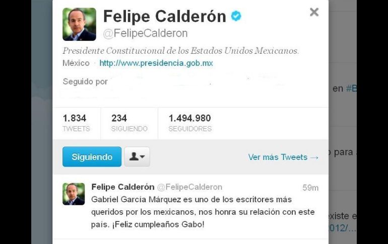 Cultura | Lo felicitó mediante las redes sociales Calderón celebra cumpleaños de 'Gabo' México celebrará el 85 aniversario del escritor colombiano Gabriel García Márquez con diversas actividades en todo el país para que sus ciudadanos se acerquen a su obra. Por: EL INFORMADOR 6 de marzo de 2012 - 12:00 hs Por Twitter, el Presidente felicita al escritor. ESPECIAL / GUADALAJARA, JALISCO (06/MAR/2012).- El Presidente Felipe Calderón se sumó a los mensajes festivos por los 85 años de vida del escritor colombiano y ganador del premio Nobel de Literatura, Gabriel García Márquez. "Gabriel García Márquez es uno de los escritores más queridos por los mexicanos, nos honra su relación con este país. ¡Feliz cumpleaños Gabo!", publicó el Mandatario a través de sus cuentas de redes sociales. México celebrará el 85 aniversario del escritor colombiano Gabriel García Márquez con diversas actividades en todo el país para que sus ciudadanos se acerquen a su obra. Se busca que la presencia de "Gabo", "esté en toda la República Mexicana y que la gente se acerque a su obra", dijo previamente Stasia de la Garza, coordinadora nacional de Literatura del Instituto Nacional de Bellas Artes (INBA). Para ello, a lo largo de este año se han organizado diversas actividades, entre ellas dos exposiciones sobre la vida y obra del Nobel de Literatura que están circulando por los distintos estados del país. Temas Literatura Felipe Calderón Gabriel García Márquez Redes Sociales Lee También Gael García combate el miedo a través del cine Taylor Swift dona 100 mil dólares a niña de dos años que lucha contra el cáncer ¿Cuánto cuesta "Mi Primer Puesto de Tacos" Mi Alegría? La Granja VIP: ¿quién será el primer eliminado este 19 de octubre? Recibe las últimas noticias en tu e-mail Todo lo que necesitas saber para comenzar tu día Registrarse implica aceptar los Términos y Condiciones