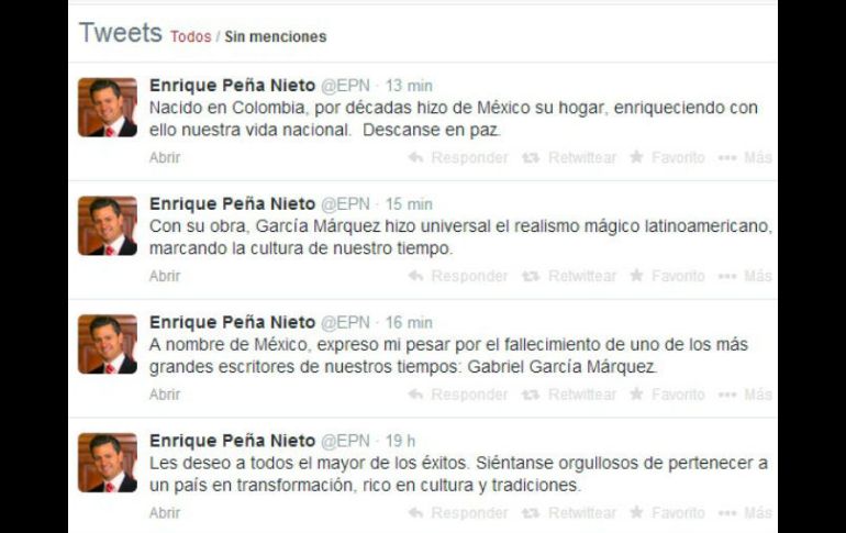 Cultura | El Presidente de México, Peña Nieto, expresa su pesar por el fallecimiento del escritor Políticos lamentan muerte de García Márquez El Presidente de México, Peña Nieto, expresa su pesar por el fallecimiento del escritor Por: EL INFORMADOR 17 de abril de 2014 - 15:27 hs El mandatario dio el mensaje mediante su cuenta de Twitter. ESPECIAL / GUADALAJARA, JALISCO (17/ABR/2014).- Uniéndose a las condolencias de los miles de lectores de todo el mundo, el Presidente de México, Enrique Peña Nieto expresó su pesar por la muerte del escritor colombiano, Gabriel García Márquez. Utilizando su cuenta de Twitter ( @EPN) el mandatario dijo: "A nombre de México, expreso mi pesar por el fallecimiento de uno de los más grandes escritores de nuestros tiempos: Gabriel García Márquez". Siguió: "Con su obra, García Márquez hizo universal el realismo mágico latinoamericano, marcando la cultura de nuestro tiempo". "Nacido en Colombia, por décadas hizo de México su hogar, enriqueciendo con ello nuestra vida nacional. Descanse en paz". Minutos antes, el Presidente de Colombia, Juan Manuel Santos también expresó su sentir por la muerte del ganador del premio Nobel de Literatura tuiteando: "Mil años de soledad y tristeza por la muerte del más grande colombiano de todos los tiempos! Solidaridad y condolencias a la Gaba y familia". El presidente de Estados Unidos, Barack Obama también lamentó la muerte del escritor. "El mundo ha perdido a uno de los más grandes escritores...uno de mis favoritos desde que era joven", postearon en la cuenta de la Casa Blanca @lacasablanca. Aquí algunos tuits de políticos que se han expresado al respecto: "@Rosario_Robles_: Ha fallecido el gran "Gabo". Una lamentable pérdida para la literatura universal. En paz descanse Gabriel García Márquez". "@eruviel_avila: "La vida no es la que uno vivió, sino la que uno recuerda, y cómo la recuerda para contarla". La humanidad te recordará con cariño, Gabo." "@GabinoCue: El Pueblo y Gobierno de Oaxaca, lamentan la pérdida irreparable de Gabriel García Márquez, Premio Nobel de Literatura y ser humano universal". "@JoseAMeadeK: Lamento profundamente la muerte de Gabriel García Márquez, cuyo talento literario unió a toda América Latina". "@ManceraMiguelMX: El Maestro Gabriel García Márquez decía: "la vida no es la que uno vivió, sino la que uno recuerda y cómo la recuerda para contarla". "?@FelipeCalderon: Lamento profundamente el muy sensible fallecimiento del gran Gabriel García Márquez. Mi sentido pésame a su familia". En Jalisco, hasta el momento el Secretario de Educación, Francisco Ayón tuiteó: "La muerte de García Márquez es una gran pérdida para la literatura universal, pero que nos duele especialmente a los latinoamericanos". EL INFORMADOR / CAROLINA QUINTANILLA Temas Literatura Enrique Peña Nieto Gabriel García Márquez Decesos de personalidades Lee También Rafael Márquez elogia la Academia AGA Revelan llamada al 911 con que se reportó la muerte de Diane Keaton Jóvenes golpean piñata de Salinas Pliego; exigen pague sus impuestos Elementos de seguridad detienen a traficante sueco en Cancún Recibe las últimas noticias en tu e-mail Todo lo que necesitas saber para comenzar tu día Registrarse implica aceptar los Términos y Condiciones