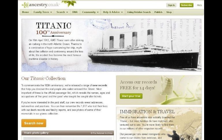 Cultura | Centenario del hundimiento Publican en la red más de 200 mil documentos relacionados con el Titanic Esos documentos, que aportan datos sobre los supervivientes de la tragedia e información sobre los mil 500 fallecidos, han sido reunidos por la página web Ancestry.co.uk y el acceso a ellos será gratuito hasta el próximo 31 de mayo Por: EFE 9 de abril de 2012 - 11:33 hs La página de Ancestry.co.uk permitirá el acceso gratuito hasta el 30 de mayo del presente año. ESPECIAL / LONDRES, INGLATERRA (09/ABR/2012).- Más de 200 mil documentos relacionados con el Titanic han sido publicados "online" por una página web británica con motivo del centenario del hundimiento del enorme barco de pasajeros en la noche del 14 al 15 de abril de 1912. Esos documentos, que aportan datos sobre los supervivientes de la tragedia e información sobre los mil 500 fallecidos, han sido reunidos por la página web Ancestry.co.uk y el acceso a ellos será gratuito hasta el próximo 31 de mayo. Entre los documentos que pueden verse en internet figuran la lista oficial de pasajeros, donde se muestran los nombres, las edades y las ocupaciones de las personas que iban a bordo y detalla también las nacionalidades, posiciones y direcciones de los más de 900 miembros de la tripulación. Igualmente, una carta de la unión de trabajadores del puerto en la que lamentan la "viciosa lucha de clases" que se enfocó a rescatar sólo a los pasajeros de primera clase, prohibiendo el acceso a los botes salvavidas a los pasajeros de tercera. También podrá contemplarse "online" el último testamento del capitán del Titanic, Edward J Smith, así como los de los acaudalados empresarios estadounidenses Benjamin Guggenheim y John Jacob Astor, que perdieron la vida en el accidente. Ese portal también publica imágenes de las lápidas de 121 víctimas, así como la lista de pasajeros del Carpathia, el barco que rescató de la muerte a más de 700 personas que iban en el Titanic. La gestora de contenidos de Ancestry.co.uk, Miriam Silverman, señaló a la agencia local Press Association que muchas familias han escuchado rumores de que tenían un familiar en el Titanic o perdieron las evidencias para demostrarlo, por eso el acceso gratuitos a estos documentos permitirá "a miles de personas descubrir la historia del viaje trágico de sus familiares". Temas Patrimonio Titanic Naufragios Recibe las últimas noticias en tu e-mail Todo lo que necesitas saber para comenzar tu día Registrarse implica aceptar los Términos y Condiciones