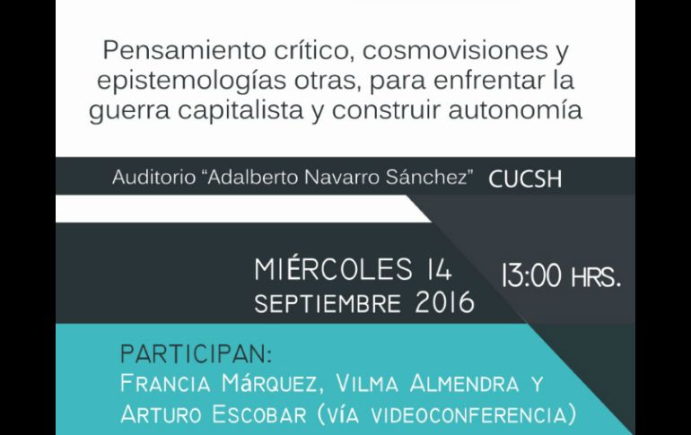 GUADALAJARA, JALISCO (13/SEP/2016).- Mediante un comunicado, la Cátedra Jorge Alonso dio a conocer las actividades que tendrán durante el año en el Centro Universitario de Ciencias Sociales y Humanidades (CUCSH).'Pensamiento crítico, cosmovisiones y epistemologías otras, para enfrentar la guerra capitalista y construir autonomía' se presentará el día miércoles 14 de septiembre a las 13:00 hrs en el Auditorio Adalberto Navarro Sánchez, en donde se podrá escuchar los trabajos y experiencias de Francia Márquez, Vilma Almendra y Arturo Escobar.El día jueves 15 de septiembre a las10:00 hrs en el Auditorio Silvano Barba del CUCSH se presentará el seminario "La paz en tiempo de la guerra global" que impartiránFrancia Marquez, Vilma Almendra y Manuel Rozental.Durante el mes de octubre del 19 al 21, presentarán el seminario "Lucha de clases y destotalización" impartido por Sergio Tischler y del 2 al 4 del mes de noviembre, el seminario "Educación para la autonomía y la defensa del territorio" impartido por Bruno Baronnet.El 29 y 30 de noviembre se llevará a cabo el XVI Encuentro Internacional sobre Cultura Democrática que se llevará a cabo dentro del marco de la Feria Internacional del Libro de Guadalajara.