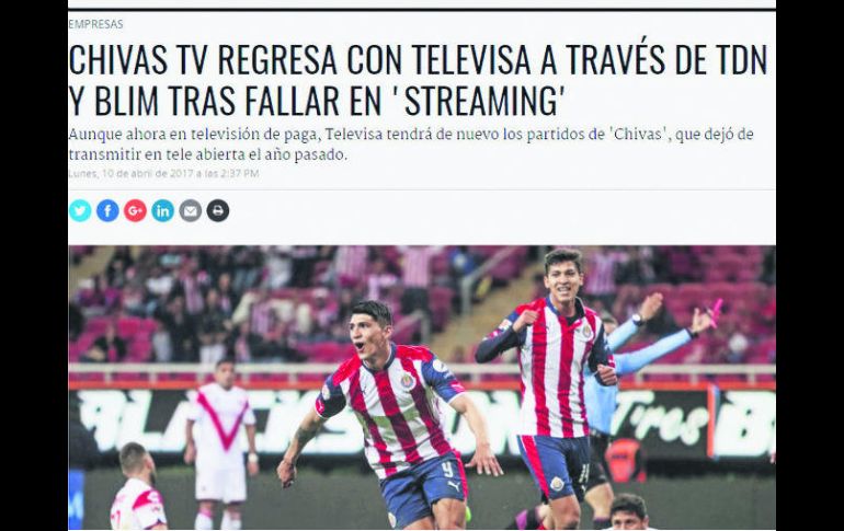 GUADALAJARA, JALISCO (11/ABR/2017).- Poderoso caballero es don dinero, y Chivas nunca es de despreciar contratos millonarios, menos uno que le representa 23 millones de dólares anuales. Así se puede resumir la venta de los derechos de transmisión del Guadalajara a Televisa para su filial TDN.Con la venta, el Rebaño hizo carambola de tres bandas. Obtuvo una liquidez envidiable, se dio baños de popularidad con aquellos que no podían acceder a los servicios de streaming, y se quitó problemas ocasionados por el servicio de Chivas TV.Esto último fue fundamental. Transmisiones importantes como los Clásicos, el Tapatío contra el Atlas y el Nacional frente al América, generaron conflictos a quienes contrataron este servicio, sólo por citar algunos casos. Con el paso de los partidos bajó el interés por adquirir el servicio, Profeco los multó, así que los altos mandos rojiblancos determinaron, al ver que era más la inversión que el beneficio, aprovechar una oferta millonaria hecha por Fox Sports que le dio un giro a la historia.Esta empresa fue la de la mejor propuesta económica, pues ESPN no llegó ni a 60% de lo que ofrecía Fox Sports, de acuerdo con una fuente enterada de la negociación.Televisa, al enterarse de estos tratos, entró a escena para hacer valer una cláusula de primera opción de compra de su anterior contrato. En dicha cláusula podía mejorar lo que ofrecía Fox o retirarse. Sucedió lo primero y pagaron.Chivas en su anterior contrato con Televisa se arregló por 12 millones de dólares anuales, así que con el nuevo acuerdo por dos años, hasta 2019, prácticamente dobló la cantidad que recibía de la misma empresa. Con este nuevo contrato, el Rebaño recibe por derechos de transmisión lo mismo que la Selección mexicana en el proceso rumbo al Mundial de Brasil 2014.Las televisoras que tuvieron los derechos del Tri, TV Azteca y Televisa, aportaron alrededor de 24 millones de dólares entre ambos a las arcas de la FMF.PARA SABER¿Por cuánto tiempo fue el acuerdo con TDN?El acuerdo fue sólo por dos años, a diferencia de los contratos multianuales que se habían firmado anteriormente.¿Qué pasará con los que pagaron Chivas TV por un año?Tendrán sus partidos sin problema. De hecho sólo quedan dos encuentros de temporada regular. Con ellos se mantienen las promociones adicionales a la televisión, tal y como lo tienen estipulado.¿Qué pasará con el resto de las plataformas de los partidos de Chivas?Claro Video y Cinépolis Klic seguirán operando con normalidad los partidos de Chivas¿TDN abrirá la señal de los partidos de Chivas en Guadalajara?Es una situación que se encuentra en periodo de análisis. Faltan tres semanas para que el Rebaño vuelva a jugar de local, así que se lo tomarán con calma.¿Desaparecerá Chivas TV tras esta campaña?No, de hecho el capital que entró por las transmisiones de TDN, servirá para que el canal pueda comenzar a producir programas y contenidos.LA CIFRA16 millones de dólares pagó Univisión por año desde 2013; firmó extensión hasta 2019LA VOZ DEL EXPERTO Chivas ya no será especialPor Roy Campos (Presidente de Consulta Mitofsky)Chivas será un equipo más, no será especial como cuando tenía Chivas TV. Dependerá de la televisora en muchos aspectos, de los comentaristas que le pongan, de la difusión que le hagan en sus espacios, lo cual no es malo, simplemente fracasó su paso por la auto exposición mediática.Existe contradicción entre la razón de la salida y la entrada. Cuando se van alegan que quieren manejar su propio medio, no depender de las cadenas y que sería un gran éxito, que el tiempo les daría la razón, que les iría de maravilla.El tiempo que duraron es efímero, regresan como si no se hubieran ido, con la televisora que les ofreció más dinero por transmisiones. Perdieron credibilidad con lo de tener su propio canal de transmisión.Es un fracaso (Chivas TV). No por regresar, sino porque no tuvo éxito en sus transmisiones, en los encuentros importantes tuvieron fallas, multas de Profeco, aficionados con quejas. No hay forma en ningún sentido de decir que fue un éxito, argumentaron que harían algo nuevo, pero esto nuevo no les funcionó y regresaron a lo tradicional, a lo que todo el mundo tiene. Una televisora les ofreció dinero y cedieron derechos.En este momento beneficia a la afición, porque Chivas TV era un riesgo para el aficionado, más ahora que se viene la Liguilla, imagina que se dé un Clásico, que lleguen a la Semifinal o Final. Siempre el aficionado corría el riesgo de que se cayera la señal y con el acuerdo, estarán tranquilos por verlo en un lugar donde eso no pasará, la cadena garantiza estabilidad.