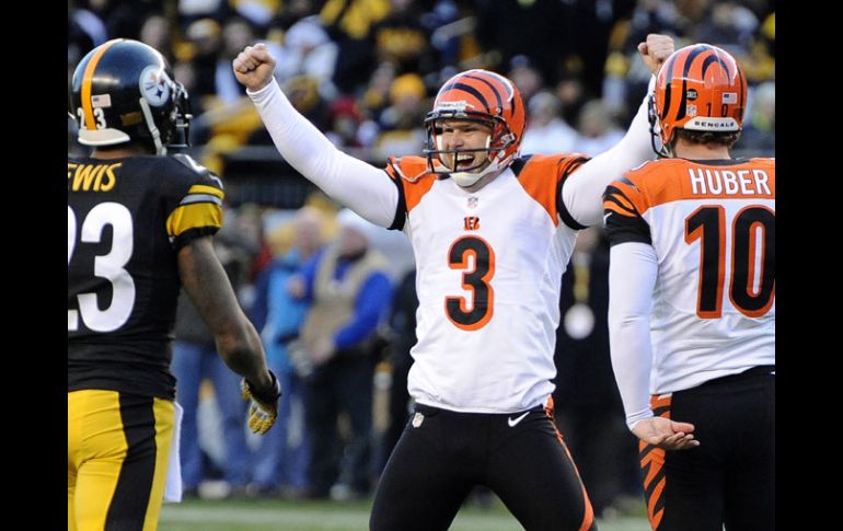 Deportes | Pittsburgh es derrotado en casa por Cincinnati 13-10 y queda eliminado Acereros, fuera de playoffs Pittsburgh es derrotado en casa por Cincinnati 13-10 y queda eliminado Por: AP 23 de diciembre de 2012 - 16:30 hs Josh Brown (3) celebra el gol de campo de la victoria sobre los Acereros. AP / PITTSBURGH, PENNSYLVANIA (23/DIC/2012).- Josh Brown pateó un gol de campo de 43 yardas con cuatro segundos por jugarse para guiar el domingo a los Bengalíes de Cincinnati a una victoria de 13-10 sobre los Acereros de Pittsburgh, enviando a los Bengalíes a la postemporada por segunda temporada consecutiva. Brown había fallado antes en el cuarto un intento de gol de campo de 56 yardas, pero obtuvo una segunda oportunidad cuando Reggie Nelson interceptó un pase a Ben Roethlisberger y regresó el balón a la yarda 46 de Pittsburgh con 14 segundos en el reloj. Andy Dalton conectó un pase de 21 yardas con A. J. Green en la siguiente jugada, preparando la patada ganadora de Brown. Dalton completó 24 de 41 pases para ganancia de 278 yardas y tuvo dos intercepciones por los Bengalíes (9-6), quienes cortaron una cadena de cinco derrotas seguidas ante Pittsburgh (7-8). Roethlisberger completó 14 de 28 pases para avance de 220 yardas con un touchdown y dos intercepciones, incluido su costoso error en los últimos segundos que terminó con las esperanzas de Pittsburgh de pasar a los playoffs. Temas NFL Futbol Americano Bengalíes de Cincinnati Acereros de Pittsburgh Recibe las últimas noticias en tu e-mail Todo lo que necesitas saber para comenzar tu día Registrarse implica aceptar los Términos y Condiciones