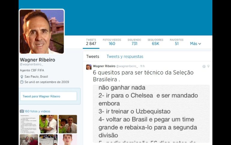 Deportes | El empresario Wagner Ribeiro, expresa su coraje a través de Twitter Agente de Neymar lanza insultos y críticas contra Scolari El empresario Wagner Ribeiro, expresa su coraje a través de Twitter Por: AFP 9 de julio de 2014 - 18:47 hs El agente del futbolista publicó en su Twitter una nota titulada 'Seis requisitos para ser técnico de la Selección Brasileña'. ESPECIAL / SAO PAULO, BRASIL (09/JUL/2014).- El agente del jugador brasileño Neymar lanzó el miércoles insultos y críticas contra el técnico de la Seleçao, Luiz Felipe Scolari, un día después de la humillante derrota 7-1 que Alemania le propinó a Brasil. El empresario Wagner Ribeiro, que también es agente de otros futbolistas brasileños, publicó en Twitter una nota titulada "Seis requisitos para ser técnico de la Selección Brasileña", sin mencionar explícitamente a Scolari. Entre los "requisitos", Ribeiro señaló "entrenar a la Selección de Portugal y no ganar nada; ir al Chelsea y ser expulsado; entrenar en Uzbekistán, volver a Brasil y tomar un equipo bueno para rebajarlo a segunda división", en tácita referencia al club paulista Palmeiras que Scolari dirigió. Ribeiro dijo que otros requisitos son "pedir el despido 56 antes días antes de la final del campeonato para 'escapar' del descenso", en alusión nuevamente al Palmeiras, y ser "prepotente y ridículo", entre otros descalificativos. Scolari fue DT de Portugal entre 2003 y 2008, adonde llegó después de conquistar la Copa del Mundo de 2002 con Brasil. Llevó al once portugués a la final de la Eurocopa-2004 frente a Grecia, con la que cayó por 1-0, y alcanzó el cuarto puesto del Mundial Alemania-2006. Brasil buscaba su sexta estrella en esta Copa del Mundo pero el sueño se truncó. Entre las razones de la derrota, es citada la baja en la semifinal del delantero Neymar, la mayor estrella del combinado verdeamarelo que sufrió una fractura en una vértebra en el juego contra Colombia por cuartos de final, quedando fuera del Mundial. En una rueda de prensa este miércoles, Felipao aseguró que no cambiaría "nada" de la preparación de Brasil para el segundo Mundial que organizó en casa. Temas Futbol Internacional Selección de Brasil Mundial Brasil 2014 Neymar Lee También México, el número uno de Concacaf según ranking de la FIFA "Israel seguirá violando los derechos del pueblo palestino"; advierte experto Accidente de autobús en Brasil deja 15 muertos Liga MX: Horarios y canales de los partidos del 18 de octubre Recibe las últimas noticias en tu e-mail Todo lo que necesitas saber para comenzar tu día Registrarse implica aceptar los Términos y Condiciones