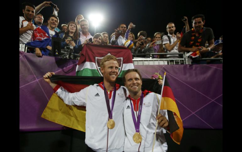 Deportes | Es el primer equipo europeo que gana un oro olímpico en este deporte Alemania obtiene oro ante Brasil en voleibol de playa Los alemanes Julius Brink y Jonas Reckermann se convirtieron en el primer equipo europeo que gana un oro olímpico en este deporte Por: REUTERS 9 de agosto de 2012 - 16:07 hs Los alemanes Julius Brink y Jonas Reckermann, campeones olímpicos en voleibol de playa. REUTERS / LONDRES, INGLATERRA (09/AGO/2012).- Los alemanes Julius Brink y Jonas Reckermann se convirtieron en el primer equipo europeo que gana un oro olímpico en el voleibol de playa al derrotar 2-1 a los brasileños Emanuel Rego y Alison Cerutti en la final de la competición masculina de los Juegos de Londres. La dupla alemana se impuso con parciales de 23-21, 16-21 y 16-14. Los brasileños Rego y Cerutti tuvieron que conformarse con la presea plateada, mientras que el bronce fue para los letones Martins Plavins y Janis Smedins. Brasil y Estados Unidos eran los únicos países que habían conquistado medallas doradas en el evento masculino hasta hoy. Las mismas dos naciones y Australia ganaron todos los oros en la competición femenina desde que el deporte hizo su debut olímpico en los Juegos de Atlanta 1996. Temas COI Juegos Olímpicos Londres 2012 Voleibol de playa Londres 2012 Lee También Lluvia arrastra camión en Puerto Vallarta (FOTOS) Puerto Vallarta continúa con bandera roja en todas sus playas Flavia Pennetta y Francesco Bagnaia, entre portadores de la antorcha olímpica 2026 Rescatan a dos personas que ingresaron al mar con bandera roja en Manzanillo Recibe las últimas noticias en tu e-mail Todo lo que necesitas saber para comenzar tu día Registrarse implica aceptar los Términos y Condiciones