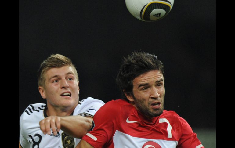 Deportes | Los alemanes vapulean por 3-0 a la escuadra de los turcos Alemania vence a Turquía Los alemanes vapulean por 3-0 a la escuadra de los turcos Por: NTX 8 de octubre de 2010 - 17:07 hs El jugador alemán Toni Kroos (iz) disputa el balón con el turco Goekhan Goenuel (der). EFE / BERLÍN, ALEMANIA (08/OCT/2010) .- Miroslav Klose anotó dos veces, Mesut Ozil una y Alemania derrotó el viernes por 3-0 a Turquía para tomar tres puntos de ventaja en el Grupo A de la clasificación para la Eurocopa 2012. Los comandados por Joachim Loew tuvieron dificultades al principio del encuentro para dominar al bien plantado equipo turco en el Estadio Olímpico de Berlín, pero Klose abrió el marcador a los 42 minutos con un balón que rebotó en el travesaño a un tiro de Thomas Müller. El delantero del Bayern Munich remató de cabeza el rebote. Ozil, un mediocampista de ascendencia turca, anotó a los 79 minutos tras recibir un pase de Philipp Lahm y dejar sin oportunidad al arquero Volkan Demirela con un trallazo. Klose cerró la cuenta a los 87 minutos al aprovechar un error del portero. Temas Futbol Internacional Selección de Alemania Eurocopa 2012 Recibe las últimas noticias en tu e-mail Todo lo que necesitas saber para comenzar tu día Registrarse implica aceptar los Términos y Condiciones