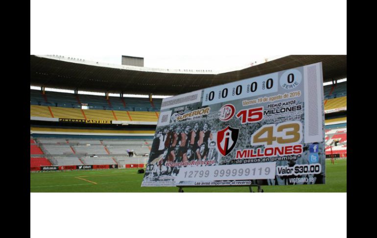 GUADALAJARA, JALISCO (03/AGO/2016).- Como parte de sus festejos del Centenario, la mañana de este miércoles, previo a la conferencia de prensa habitual del "Profe" Cruz, el propio director técnico y el delantero Daniel Álvarez, develaron lo que será el Billete de la Lotería Nacional conmemorativo al festejo rojinegro por sus 100 años de fundación.A partir de este miércoles 3 de agosto comienza la venta y circulación del Billete en todo la República Mexicana, mismo que será válido para el Sorteo Superior del próximo viernes 19 de agosto, días después del festejo por el primer siglo de vida del club rojinegro.En el Billete se hace un homenaje a grandes figuras del equipo de la década de los 70’s, fue ahí cuando Atlas tomó uno de los motes más tradicionales, "Los amigos del balón". En la imagen aparecen Héctor Brambila, Julián Bonifacino, Antonio Serrano, "Tilín" Méndez, "Pillo" Herrera, "Astroboy" Chavarín, Amaury da Silva, "Berna" García y José Delgado.El premio principal es de 7.5 millones de pesos en una serie, la cual tendrá un costo de $600 pesos, mientras que cada cachito tendrá un costo de $30 pesos. EL INFORMADOR / JAVIER ROBLES