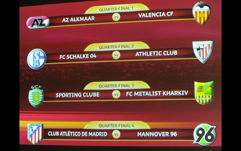 Deportes | Listo el sorteo de los cuartos de final de la Europa League Atlético de Madrid va contra Hannover en cuartos AZ Alkmaar, Schalke y Hannover son los rivales de Valencia, Athletic Club de Bilbao y Atlético de Madrid en la Europa League, respectivamente Por: EFE 16 de marzo de 2012 - 07:09 hs Resultado del sorteo de cuartos de final de la Liga Europa celebrado en la sede de la UEFA en Suiza. EFE / NYON, SUIZA (16/MAR/2012).- El AZ Alkmaar holandés, el Schalke y el Hannover alemanes son los rivales de Valencia, Athletic Club de Bilbao y Atlético de Madrid, respectivamente, en los cuartos de final de la Europa League, según el sorteo celebrado en la sede de la UEFA en Nyon (Suiza). El Valencia y el Atlético de Madrid se enfrentarían en una hipotética semifinal si superan los cuartos, en tanto que el Athletic se medirá al ganador del Sporting Lisboa-Metalist Kharkiv. Partidos de cuartos de final (29 marzo/5 abril) : 1. AZ Alkmaar (HOL) - Valencia (ESP) 2. Schalke 04 (GER) - Athletic Club (ESP) 3. Sporting Lisboa (POR) - Metalist Kharkiv (UKR) 4. Atlético de Madrid (ESP) - Hannover 98 (GER) Partidos de semifinales (19/26 abril) : 1. Ganador 4 - Ganador 1 2. Ganador 3 - Ganador 2 Final (National Arena de Bucarest, 9 mayo) Ganador Semifinal 1 - Ganador Semifinal 2 Temas Futbol Internacional Europa League Atlético de Madrid Recibe las últimas noticias en tu e-mail Todo lo que necesitas saber para comenzar tu día Registrarse implica aceptar los Términos y Condiciones