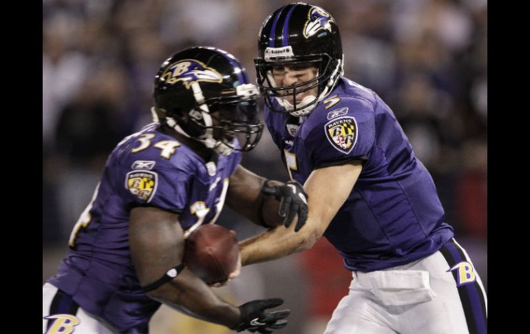 Deportes | Cuervos se imponen ante Texanos 29-14 Baltimore se las arregla para ganar Cuervos se imponen ante Texanos 29-14 Por: AP 16 de octubre de 2011 - 17:54 hs Joe Flacco (D) hace un pase con Ricky Williams durante el encuentro en Maryland. AP / BALTIMORE, MARYLAND (16/OCT72011).- Joe Flacco lanzó para 305 yardas y tuvo una anotación por tierra el domingo, mientras que el pateador Billy Cundiff consiguió cinco goles de campo para que los Cuervos de Baltimore sacaran el triunfo 29-14 sobre los Texanos de Houston. Los Cuervos (4-1) hicieron lo justo en defensiva para llevarse su tercera victoria consecutiva. Baltimore mantuvo a Houston sin anotación durante los últimos 21 minutos y limitó a 49 yardas en 15 intentos al destacado corredor Arian Foster. Flacco perdió el balón dos veces, pero también logró pases completos de 51 y 56 yardas para poner a Cundiff en posición de anotar. Cundiff conectó goles de campo de 43, 48, 25, 33 y 40 yardas para empatar el récord de los Cuervos de goles de campo en un partido. Flacco completó 20 de 33 pases y Anquan Boldin tuvo ocho recepciones para 132 yardas. Aunque los Texanos (3-3) jugaron sin el receptor Andre Johnson ni el linebacker Mario Williams, estuvieron al frente un breve período del encuentro en el tercer cuarto y perdían sólo 19-14 hasta la anotación de 4 yardas del corredor Ricky Williams con 4:01 en el reloj. Temas NFL Futbol Americano Cuervos de Baltimore Texanos de Houston Recibe las últimas noticias en tu e-mail Todo lo que necesitas saber para comenzar tu día Registrarse implica aceptar los Términos y Condiciones