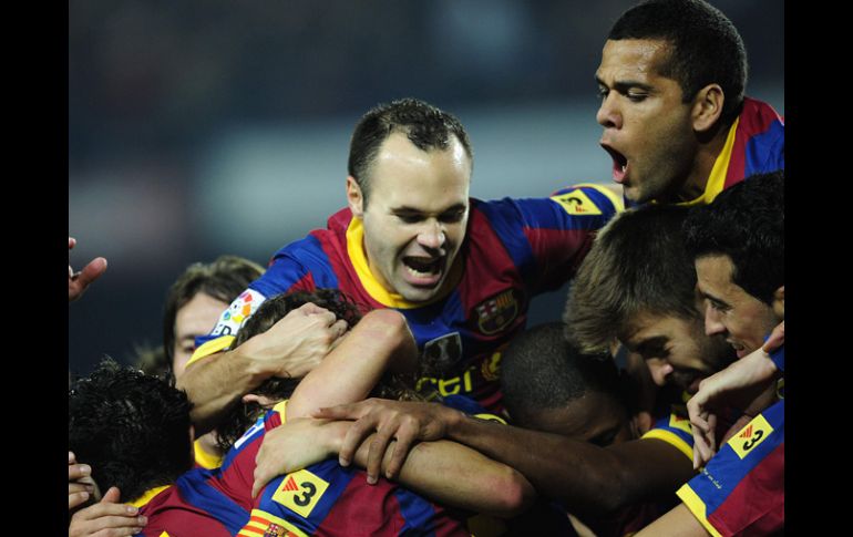 El Barcelona festeja el triunfo ante Valencia. AP /