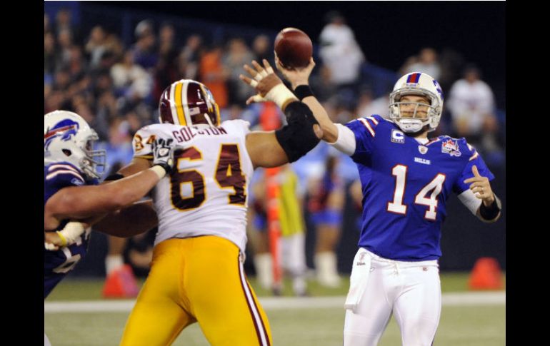 Deportes | Pieles Rojas pierden por tercera vez consecutiva Bills consigue triunfo 'a domicilio' Pieles Rojas pierden por tercera vez consecutiva Por: AP 30 de octubre de 2011 - 17:44 hs Ryan Fitzpatrick (14) marca uno de los touchdowns que marcaron el 24 a favor de Buffalo. AP / TORONTO, CANADA (30/OCT/2011).- Ryan Fitzpatrick lanzó el domingo dos pases de touchdown y la defensiva de los Bills tuvo nueve capturas de quarterback para vapulear 23-0 a los Pieles Rojas de Washington en la casa adoptiva de Buffalo en Canadá. Scott Chandler atrapó los dos pases de touchdown, incluido uno de 15 yardas al comenzar el tercer período, que pusieron adelante a Buffalo por 20-0. Fred Jackson avanzó 120 yardas por tierra y 74 por aire para ayudar a los Bills (5-2) a lograr su primer arranque de temporada con foja de 4-0 en "casa" desde 1995. Los Pieles Rojas (3-4) han perdido tres en fila y siguen teniendo problemas con lesiones. Sin el running back Tim Hightower y el receptor Santana Moss, el ataque dirigido por John Beck tuvo 178 yardas a la ofensiva y 10 primero y down. Temas NFL Futbol Americano Bills de Buffalo Pieles Rojas de Washington Recibe las últimas noticias en tu e-mail Todo lo que necesitas saber para comenzar tu día Registrarse implica aceptar los Términos y Condiciones