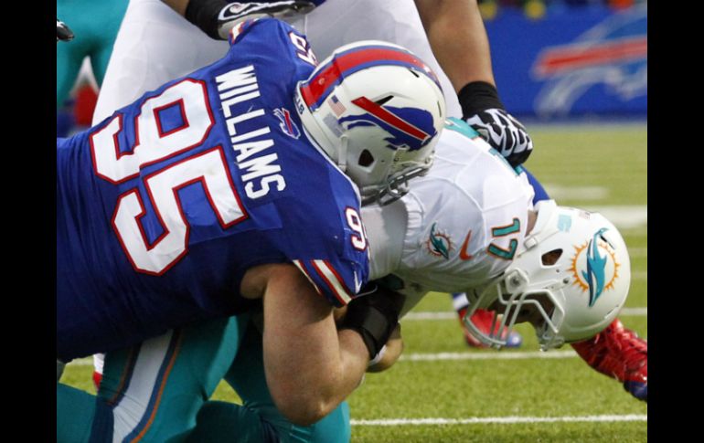 Deportes | Con su victoria de 19-0, Buffalo reduce las aspiraciones de playoffs de Miami Bills dejan agonizando a los Delfines Con su victoria de 19-0, Buffalo reduce las aspiraciones de playoffs de Miami Por: AP 22 de diciembre de 2013 - 15:33 hs Buffalo capturó en siete ocasiones al mariscal de campo de los Delfines. AP / ORCHARD PARK, NUEVA YORK (22/DIC/2013).- Kyle Williams detuvo al mariscal de campo de Miami detrás de la línea dos veces y los Bills de Buffalo dejaron en la cuerda floja las aspiraciones de los Delfines de llegar a la postemporada al derrotarlos el domingo por 19-0. Fred Jackson logró 111 yardas por tierra y anotó en una jugada de nueve yardas, mientras la defensa de los Bills limitó a los Delfines a apenas 103 yardas, su ofensiva más baja de la temporada. En su último partido como locales esta temporada, los Bills (6-9) derribaron al mariscal rival en siete ocasiones y llegaron a 56 capturas en la campaña, una nueva marca para el equipo. Dan Carpenter selló el triunfo al acertar cuatro goles de campo, uno de ellos de 45 yardas. Los Delfines (8-7) vieron interrumpirse su racha de tres victorias y corren peligro de no clasificarse a la postemporada por quinta temporada al hilo. Miami necesita ayuda de otros equipos para tener una oportunidad y cierra la campaña recibiendo a los Jets de Nueva York la próxima semana. Temas NFL Futbol Americano Bills de Buffalo Delfines de Miami Recibe las últimas noticias en tu e-mail Todo lo que necesitas saber para comenzar tu día Registrarse implica aceptar los Términos y Condiciones