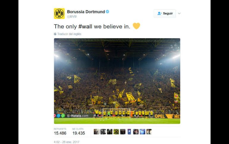 GUADALAJARA, JALISCO (26/ENE/2017).- El equipo de la Bundesliga se sumó, debido a la publicación de una fotografía, a la lista de figuras del deporte que alzan la voz para promover la unión entre las personas, luego del anuncio del presidente de Estados Unidos, Donald Trump, de construir un muro en la frontera con México.Por medio de su cuenta oficial de Twitter, el cuadro teutón publicó una imagen de sus jugadores formando una valla frente a la portería, donde al fondo se visualiza la afición que, según señalan, es considerada de las más leales del planeta. Así mismo, junto a la fotografía se colocó un mensaje en inglés que dice “El único muro en el que creemos”, en alusión al presidente estadounidense.El tuit ocasionó y sigue generando hasta el momento reacciones de todos los sectores y muchos agradecen el gesto del equipo.Este miércoles, el futbolista mexicano Rafael Márquez actuó de manera similar al utilizar la red social para emitir un mensaje tras el anuncio del magnate.