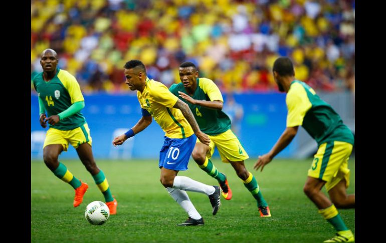 BRASILIA, BRASIL(04/AGO/2016). -Brasil comenzó con una deuda costosa su camino en el torneo de fútbol masculino de los Juegos Olímpicos de Rio de Janeiro 2016 al empatar cero a cero este jueves con Sudáfrica, en partido del Grupo A disputado en Brasilia. La seleçao, que adolece del oro olímpico en su rico palmarés, se encontró a unos 'Bafana Bafana' tirados en defensa en buena parte de los 90 minutos y a la espera de pescar en río revuelto, un panorama que complicó la dinámica de juego del combinado del astro Neymar, que mostró dos caras en el encuentro.Más temprano en el mismo estadio mundialista Mané Garrincha y ante escasísimo público, Dinamarca e Irak firmaron un cero a cero en un partido discreto y con pocas situaciones de peligro en ambos arcos.La segunda fecha de esta zona, el sábado y nuevamente en Brasilia, contempla los partidos entre Dinamarca y Sudáfrica y Brasil contra Irak.Brasil: Weverton - Zeca, Marquinhos (amonestado, 90+3), Rodrigo Caio, Douglas Santos (William, 84) - Thiago Maia (amonestado, 73), Renato Augusto (Rafinfa, 67), Felipe Anderson (Luan, 60) - Gabriel Jesús, Neymar y Gabriel Barbosa. DT: Rogérico Micale.Sudáfrica: Itumeleng Khune - Abbubaker Mobara, Mulomowandau Mathoho (amonestado, 90), Rivaldo Coetzee, Aubrey Modiba (Phumlani Ntshangase, 70) - Mothobi Mvala (expulsado, 60), Deolin Mekoa, Gift Motupa - Menzi Masuku (Tashreeq Morris, 58), Lebo Mothiba y Keagan Dolly. DT: Owen Da Gama.