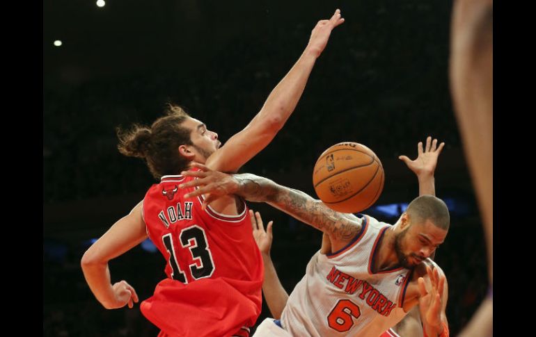 Tyson Chandler, número 6 de los Knicks de Nueva York, disputa la pelota a Joakim Noah de los Toros de Chicago. AFP  /