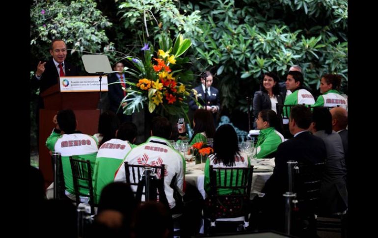 Deportes | El Presidente agradece a los deportistas por mostrar el lado exitoso de México Calderón agasaja a los medallistas panamericanos El Presidente agradece a los deportistas por mostrar el lado exitoso de México Por: SUN 10 de noviembre de 2011 - 04:26 hs Felipe Calderón (izq.) agasajó a los ganadores de los Juegos. EL UNIVERSAL / CIUDAD DE MÉXICO (10/NOV/2011).- El Presidente de México Felipe Calderón recibió en la residencia oficial de Los Pinos a atletas ganadores de medallas en los Juegos Panamericanos de Guadalajara. Calderón sostuvo que los ganadores de preseas arrancaron todos los malos augurios y dieron fe de un México exitoso. “Más que ganar una medalla u otra, lo que ustedes han logrado, lo que ustedes le han dado a México, es recuperar, arrancar, de todas las malas profecías, de todos los malos augurios, arrancar y devolverle a los mexicanos, a las mexicanas y a los mexicanos, la confianza en nosotros mismos. El haber devuelto a México su enorme derecho de afirmarse como un gran país, exitoso, de triunfo, ganador con todas sus letras, como ganadores han sido ustedes en los Panamericanos y sé que lo seguirán siendo en las cuestiones por venir”, apuntó el Jefe del Ejecutivo. Calderón Hinojosa se mostró complacido por la histórica actuación de los deportistas locales en la justa continental, ya que consiguieron 42 medallas de oro, cifra récord para una delegación tricolor, además de 41 platas y 50 bronces, para implantar récord de 133 preseas totales logradas por el contingente nacional. Por otra parte, recordó que dentro de este total de medallas, varias de ellas, 16 en total, fueron conseguidas por deportistas que representaban a las Fuerzas Armadas de México, quienes obtuvieron siete preseas doradas, cinco platas y cuatro bronces. Destacó que entre estas medallas resaltan las dos de oro que obtuvo la fondista Marisol Romero, quien ganó las pruebas de cinco y 10 mil metros, así como la gran victoria del pentatleta Óscar Soto, quien con el oro logrado en Guadalajara obtuvo su pase a los Juegos Olímpicos Londres 2012. EL DATOInvita a solucionar conflictos Calderón hizo un llamado a las federaciones conflictivas, como la de basquetbol, a que solucionen los problemas, pues considera que hay mucho talento por explotar. Temas Felipe Calderón Juegos Panamericanos 2011 Recibe las últimas noticias en tu e-mail Todo lo que necesitas saber para comenzar tu día Registrarse implica aceptar los Términos y Condiciones
