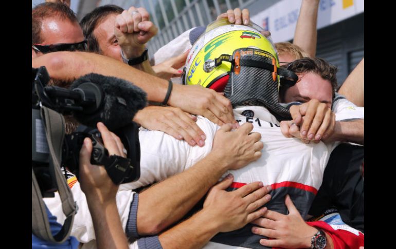 Deportes | Destacó que Checo Pérez haya subido nuevamente al podium Calderón felicita a Pérez por 'extraordinaria carrera' El mandatario calificó de extraordinaria la carrera que hizo el mexicano al pasar del décimo segundo al segundo lugar en el que terminó la prueba Por: NTX 9 de septiembre de 2012 - 08:30 hs El piloto mexicano es felicitado por su segundo lugar en la carrera. REUTERS / CIUDAD DE MÉXICO (09/SEP/2012).- El Presidente Felipe Calderón felicitó a través de su cuenta de Twitter al piloto mexicano de Fórmula 1 Sergio Pérez, por su desempeño en la carrera de Monza, Italia. El mandatario calificó de extraordinaria la carrera que hizo el mexicano al pasar del décimo segundo al segundo lugar en el que terminó la prueba. Destacó también que "Checo" Pérez volvió a subir el pódium como ya lo ha hecho en otras ocasiones en esa competitiva temporada de Fórmula 1. "Extraordinaria carrera de @SChecoPerez en Monza. Avanza del 12º al 2º lugar. Nuevamente sube al pódium. Mil felicidades!!!", señaló el presidente en su mensaje enviado en la red social. El corredor mexicano superó en la prueba a los bólidos de la escudería Ferrari en su propia casa. Además logró superar a 10 corredores para terminar en la segunda posición de la prueba y subir al pódium de premiaciones. Temas Felipe Calderón Automovilismo Sergio Pérez Lee También Max Verstappen se lleva la pole para el Sprint del GP de Estados Unidos Norris domina en Austin, pero la sorpresa la da Hülkenberg Arranca el GP de Estados Unidos 2025 con formato Sprint ¿A qué hora es y dónde ver EN VIVO el GP de EU 2025 de F1? Recibe las últimas noticias en tu e-mail Todo lo que necesitas saber para comenzar tu día Registrarse implica aceptar los Términos y Condiciones
