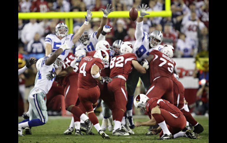 Deportes | Un gol de campo en los segundos finales dio la victoria a Arizona por 27-26 Cardenales viene de atrás y vence a Vaqueros Un gol de campo en los segundos finales dio la victoria a Arizona por 27-26 Por: AP 26 de diciembre de 2010 - 07:43 hs Jay Feely (4) patea el gol de campo de la victoria sobre Dallas. AP / GLENDALE, ARIZONA (26/DIC/2010).- El gol de campo de 48 yardas de Jay Feely pasó apenas encima de la barra horizontal, con 10 segundos en el reloj, para arruinar un regreso espectacular de Dallas y darle el sábado a los Card enales una victoria por 27-26 sobre los Vaqueros. Dallas (5-10) se recuperó de una desventaja de 18 puntos para irse arriba por 26-24 cuando Stephen McGee, en su debut en la NFL, lanzó un pase de 45 yardas para touchdown a Miles Austin con un minuto y 46 segundos por jugar. Arizona (5-10) estaba en graves problemas, pero el novato John Skelton, en cuarta oportunidad y 15 por avanzar lanzó un pase de 26 yardas al también novato Max Komar y los Cardenales avanzaron hasta quedar cerca del alcance de Feely. El pateador, quien acababa de anotar un gol de campo de 49 yardas, ha fallado tres intentos en la temporada, entre ellos uno de 49 yardas el sábado. Dallas cayó 14-0 al comienzo del encuentro luego de que San Luis interceptó en dos ocasiones a Kitna con devolución para touchdown en las primeras dos ofensivas de los Vaqueros. Temas NFL Futbol Americano Vaqueros de Dallas Cardenales de Arizona Recibe las últimas noticias en tu e-mail Todo lo que necesitas saber para comenzar tu día Registrarse implica aceptar los Términos y Condiciones