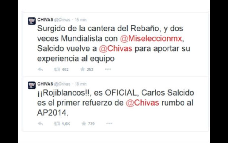 Deportes | Chivas confirma la llegada del jugador en su cuenta de Twitter Carlos Salcido llega a reforzar al Rebaño A través de su cuenta de Twitter, Chivas confirma la llegada de su primer refuerzo para el Torneo Apertura 2014 Por: EL INFORMADOR 20 de mayo de 2014 - 22:42 hs Este fue el mensaje con el que el equipo rojiblanco dio a conocer la noticia en su cuenta de Twitter.@chivas / GUADALAJARA, JALISCO (20/MAY/2014).- En su cuenta de Twitter, el club Guadalajara anunció la contratación de Carlos Salcido, quien llega proveniente de Tigres, institución con la cual se llegó a un arreglo y una vez que el jugador regrese de su aventura en Brasil 2014, con la Selección nacional, entonces firmará su contrato, tiempo del mismo y lo que quiere ganar. El primer refuerzo desató alegría entre los aficionados en las redes sociales, pues saben que con él, el sector izquierdo, la contención o bien la central, tendrán un jugador que sabe cubrir perfectamente y sin lugar a dudas es una solución. El presidente deportivo Juan Manuel Herrero, precisó que espera cerrar la mayor cantidad de los jugadores que ya tienen avanzados, por lo pronto apuntan a contratar seis elementos, ya les faltan cinco más. EL INFORMADOR / Alejandro Ramírez Temas Chivas Carlos Salcido Lee También Orbelín Pineda destaca su orgullo por volver a Guadalajara con el Tricolor Morena Jalisco respalda Reforma Judicial Chivas Femenil asegura su pase a la Liguilla por doceavo torneo consecutivo Chivas Femenil no puede con Puebla y deja escapar puntos en el estadio AKRON Recibe las últimas noticias en tu e-mail Todo lo que necesitas saber para comenzar tu día Registrarse implica aceptar los Términos y Condiciones