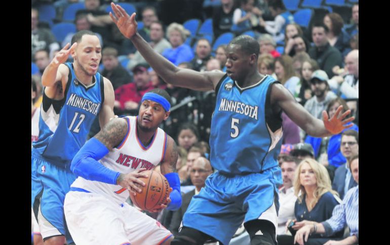 Deportes | NBA. Temporada 2015-2016 Carmelo detiene mala racha de Knicks Los Knicks de Nueva York conjuraron una racha de siete derrotas consecutivas Por: EFE 20 de febrero de 2016 - 23:33 hs Carmelo Anthony (centro), de los Knicks de Nueva York, ante la marca de dos jugadores de los Timberwolves de Minnesota. AP / J. Mone ESTADOS UNIDOS (21/FEB/2016).- El alero Carmelo Anthony aportó un doble-doble de 30 puntos y 11 rebotes y los Knicks de Nueva York pusieron fin a una racha de siete derrotas seguidas al derrotar como visitantes a 103-95 a los Timberwolves de Minnesota. La victoria es la primera para el entrenador interino Kurt Rambis desde que tomó el puesto después de que Derek Fisher fuera despedido hace tres semanas. Los Knicks (24-33), que marchan terceros en la División Atlántico, pudieron detener una racha de siete partidos perdidos de manera consecutiva y sumaron su primera victoria desde el 29 de enero cuando vencieron a los Suns de Phoenix. El pívot Robin López logró un doble-doble de 26 puntos y 16 rebotes. Temas NBA Basquetbol Recibe las últimas noticias en tu e-mail Todo lo que necesitas saber para comenzar tu día Registrarse implica aceptar los Términos y Condiciones