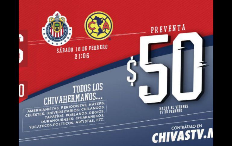 GUADALAJARA, JALISCO (09/FEB/2017).- Chivas TV anunció que ofrecerá el encuentro contra América con un precio de preventa de 50 pesos a quienes contraten el encuentro antes del 17 de febrero.En el pasado la transmisión del el partido, conocido como Clásico Nacional, tuvo un costo de hasta 500 pesos.Ahora, pagando 50 pesos los aficionados podrán disfrutar del partido en vivo.Chivas TV, el sistema de transmisión en línea del Club Deportivo Guadalajara, ha generado polémica a causa de las fallas técnicas que ha presentado. El caso más reciente de dio el pasado en el amistoso Chivas-Boca. El club tapatío se vio obligado a ofrecer reembolsos a los aficionados argentinos que pagaron por el partido a causa de las dificultades en la transmisión.Los rojiblancos recibirán a los Capitalinos en el Estadio Chivas el próximo sábado 18 de febrero en punto de las 21:06 horas.