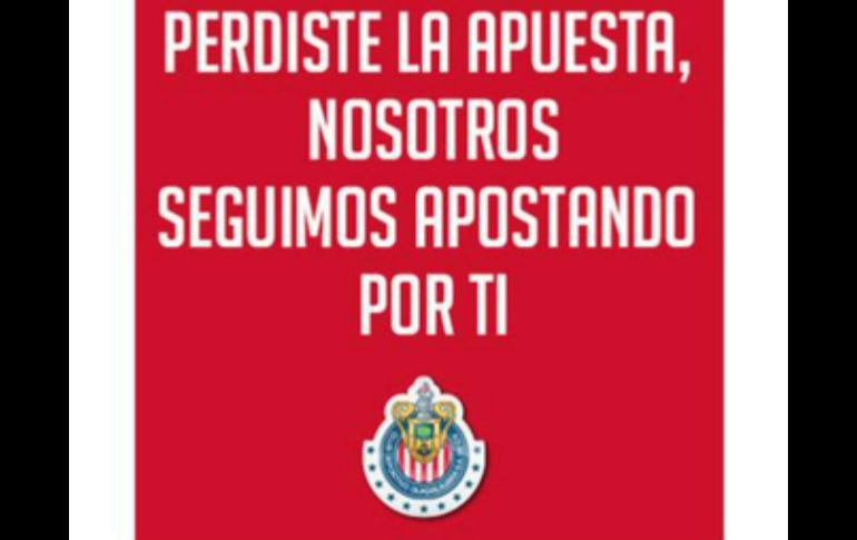 Deportes | Eliminan la imagen que intentaba dar ánimos a una afición dolida Chivas se arrepiente de tuit polémico tras el Clásico Eliminan la imagen que intentaba dar ánimos a una afición dolida Por: EL INFORMADOR 31 de marzo de 2014 - 17:55 hs Al parecer el mensaje genera una respuesta distinta a la que se pensó en un inicio. ESPECIAL / GUADALAJARA, JALISCO (31/MAR/2014).- Pocas horas duró el tuit de Chivas en el que intentaba dar consuelo a su afición. Esta tarde en la cuenta de Twitter @Chivas ya no se puede ver la imagen con la leyenda “Perdiste la apuesta, nosotros seguimos apostando por ti”. Al parecer el mensaje generó una respuesta distinta a la que se pensó en un inicio y se pudieron observar críticas y malestar por el mal paso del Rebaño. Mientras tanto en el nido de las Águilas del América la fiesta sigue y se mantiene una imagen difundida la noche del domingo en la que se lee: "Podrás correr pero nunca volarás". Temas Chivas Futbol Mexicano Águilas del América Clásico nacional Twitter Redes Sociales Liga MX Clausura 2014 Lee También Futbol hoy 11 de octubre de 2025: ¿Dónde ver los partidos en vivo? Mbappé brilla en su regreso a París 'Chucky' Lozano hace ilusionar a Chivas con una declaración sobre su futuro Dólar sube ante tensiones comerciales y preocupaciones fiscales Recibe las últimas noticias en tu e-mail Todo lo que necesitas saber para comenzar tu día Registrarse implica aceptar los Términos y Condiciones