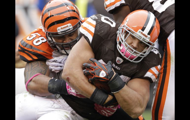 Deportes | Terrel Owens tuvo una gran partido pero no fue suficiente para evitar la derrota de su equipo Cleveland consigue su primera victoria Los Cafés vencen 23-20 a los Bengalíes de Cincinnati y consiguen cortar la mala racha Por: AP 3 de octubre de 2010 - 15:50 hs Peyton Hillis de los Marrones de Cleveland (cen) lucha con la defensa de los Bengalíes. AP / CLEVELAND, OHIO (03/OCT/2010).- El corredor Peyton Hillis ganó el domingo 102 yardas y tuvo una anotación, Phil Dawson conectó tres goles de campo y los Cafés de Cleveland finalmente sostuvieron una ventaja en el cuarto período sobreviviendo a un muy buen desempeño de Terrell Owens para obtener su primera victoria, de 23-20 sobre los Bengalíes de Cincinnati. Los cafés (1-3) habían perdido sus tres primeros encuentros por un total de 12 puntos. Pero en esta ocasión se sobrepusieron a un castigo costoso, realizaron una captura crucial del mariscal de campo Carson Palmer en los últimos minutos y aguantaron una actuación de 220 yardas ganadas en 10 pases atrapados por parte del receptor abierto Owens, quien además se movió al segundo lugar de la NFL en yardas ganadas por aire. Los Bengalíes (2-2) vieron cortada su cadena de ocho triunfos consecutivos en la División Norte de la Conferencia Americana. Temas NFL Futbol Americano Bengalíes de Cincinnati Cafés de Cleveland Recibe las últimas noticias en tu e-mail Todo lo que necesitas saber para comenzar tu día Registrarse implica aceptar los Términos y Condiciones