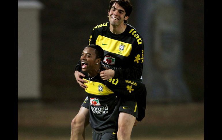 Deportes | Quien clasifique a cuartos enfrentará al vencedor de Holanda vs, Eslovaquia Con bajas y retornos, Brasil recompone filas Felipe Melo y Julio Baptista han sido reportados como lesionados y Elano, Kaká y Robinho se encuentran listos para enfrentar con su Selección a los chilenos Por: AFP 26 de junio de 2010 - 18:26 hs Kaká y Robinho listos para los cotavos contra Chile. EFE / JOHANNESBURGO, SUDÁFRICA (26/JUN/2010).- La Selección brasileña recomponía filas contrarreloj este sábado afectada por las lesiones de los mediocampistas Felipe Melo y Julio Baptista y con la vuelta al equipo titular de los volantes Kaká y Elano y el punta Robinho, para el duelo del lunes en octavos contra Chile. Mientras los que no estuvieron en campo en el empate 0-0 del viernes ante Portugal, al cierre de la llave G, practicaban el sábado en un campo del colegio Saint Stithians, en Sandton, incluidos el astro Kaká, Robinho y Elano, la preocupación auriverde estaba en torno a la recuperación de Melo y Baptista. Brasil debe chocar en el estadio Ellis Park local con Chile, segundo del Grupo H, ganado por España, luego que el viernes en Durban el empate 0-0 con Portugal le dejara como líder del Grupo G con 7 puntos, encima de los lusos, clasificados segundos con 5 y ahora rivales de la 'Roja' europea. La 'Canarinha' volvió a Johannesburgo para concentrarse de cara al decisivo choque y con especial atención a Melo y Baptista, que salieron lesionados ante los lusos y ahora están en duda y en proceso de recuperación. Este sábado, el jefe de prensa del equipo, Rodrigo Paiva, sostuvo que ambos estarían fuera definitivamente del choque del lunes. Melo tiene una torcedura de tobillo que le impide caminar normalmente y el segundo su rodilla derecha hinchada. Así, Paiva confirmó que el cuerpo médico tiene bajo tratamiento y observación a los dos futbolistas y su recuperación "será similiar a la que tuvo Elano", quien estuvo varios días con trabajo diferenciado y se perdió el juego ante Portugal. Eso implica que llevará varios días para que Melo y Baptista vuelvan a campo, pues Elano perdió días de entrenamiento y realizó fisioterapia como trabajo diferenciado por un golpe en su pantorrilla que le impidó jugar el duelo con los europeos. De su lado, los mediocampistas Kaká y Elano, junto al punta Robinho, entrenaron sin problemas este sábado con los suplentes, por lo que estarán a la orden para volver contra Chile. El astro Kaká, volverá tras cumplir suspensión por su expulsión contra los marfileños, lo que obligó para el último cotejo a la entrada de Baptista, quien aunque se recupere de todas formas volvería al banco. Elano volvió a la actividad el viernes y el sábado entrenó normalmente, recuperado de un golpe en la pantorrilla que le hizo salir el domingo previo en el 3-1 ante Costa de Marfil. De su lado, Robinho, que tenía una molestia muscular leve, fue reservado por Dunga y estuvo en el banco ante los portugueses para dejar lugar a Nilmar. Si bien no jugó, el atacante del Santos confirmó luego que está en plenitud de condiciones. Uno que jugó ante Portugal pero igual demanda cuidado especial es el portero Julio César, que si bien se asegura está en buenas condiciones. Contra Portugal jugó usando una protección especial de espalda por un golpe que recibió en un amistoso ante Zimbabue (3-0) que le dejó afuera varios entrenamientos y otro fogueo con Tanzania (5-1). El domingo, la 'Seleçao' realizará su última práctica en un colegio local. Temas FIFA Selección de Brasil Mundial de Sudáfrica 2010 Recibe las últimas noticias en tu e-mail Todo lo que necesitas saber para comenzar tu día Registrarse implica aceptar los Términos y Condiciones