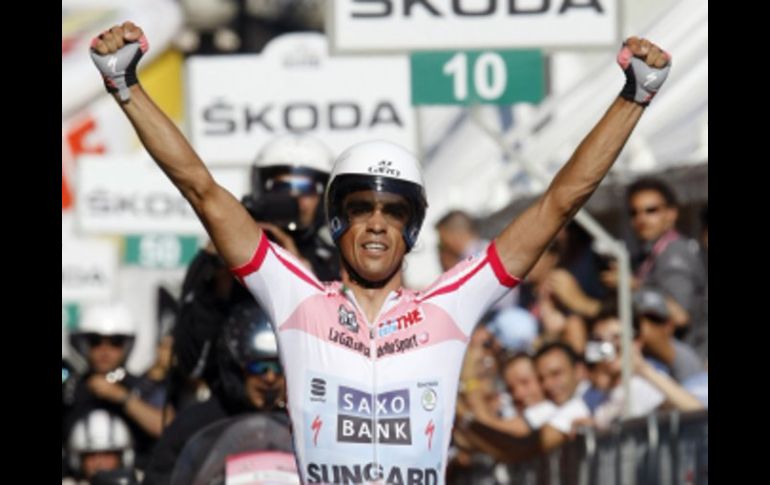 Deportes | El ciclista español conquistó su segundo título de la competencia italiana Contador repite triunfo en Giro de Italia El ciclista español conquistó su segundo título de la competencia italiana Por: EFE 29 de mayo de 2011 - 10:13 hs Alberto Contador celebra tras llegar a la meta de la última etapa del Giro de Italia. REUTERS / MILÁN, ITALIA (29/MAY/2011).- .- El español Alberto Contador conquistó hoy en la plaza del Duomo su segundo Giro de Italia tras la vigésima primera y última etapa, una contrarreloj de 26 kilómetros en la que se impuso el británico David Millar con un tiempo de 30:13. Vestido con la "maglia" rosa de líder desde la novena etapa, Contador ha dominado con gran autoridad la ronda italiana a la espera de la resolución del Tribunal de Arbitraje Deportivo (TAS) sobre los recursos contra su absolución en el caso del positivo por clembuterol en el pasado Tour de Francia. Los italianos Michele Scarponi y Vincenzo Nibali, segundo y tercero, acompañaron a Contador en el podio final del Giro. En la última etapa, el británico David Millar, a una media de 51,627 km/h, marcó pronto un tiempo de referencia (30:13) que ya no pudo superar ninguno de los 103 corredores que tomaron la salida después que él. Temas Ciclismo Alberto Contador Giro de Italia UCI Lee También Isaac del Toro podría competir en México; esto es lo que se sabe Mundial Sub-20: EU golea a Italia y enfrentará a Marruecos Isaac Del Toro gana... ahora en el Gran Piemonte 2025 Omar "N", exjugador de Chivas, ya había sido encarcelado; aquí el motivo Recibe las últimas noticias en tu e-mail Todo lo que necesitas saber para comenzar tu día Registrarse implica aceptar los Términos y Condiciones