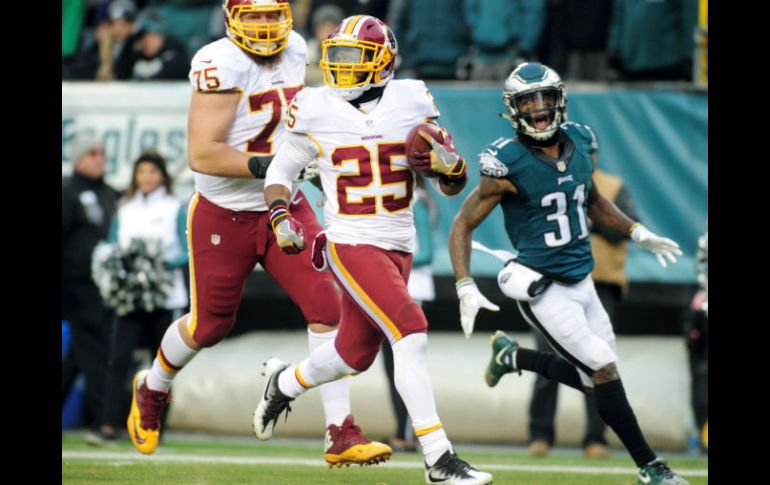 FILADELFIA, PENNSYLVANIA (11/DIC/2016).- Una carrera de 25 yardas para touchdown de Chris Thompson a 1:54 minutos del final dio a los Pieles Rojas de Washington una victoria el domingo de 27-22 sobre las Águilas de Filadelfia.Kirk Cousins lanzó dos pases para touchdown, uno de ellos de 80 yardas a DeSean Jackson, y sufrió una intercepción para anotación.Las Águilas tomaron una ventaja de 22-21 cuando Caleb Sturgis conectó un gol de campo de 41 yardas con 4:59 minutos restantes después que el holder Donnie Jones logró corregir a tiempo un snap alto de Trey Burton.Carson Wentz llevó a Filadelfia a la yarda 14 de los Pieles Rojas en el minuto final, pero Ryan Kerrigan lo capturó para causar el balón suelto y sellar la victoria de Washington.Los Pieles Rojas (7-5-1) rompieron una serie de dos derrotas seguidas y se mantienen en medio de una desordenada lucha por un boleto a playoffs.Las Águilas (5-8) han perdido por cuarta vez seguida y ocho de sus últimos 10 después de un inicio de temporada de 3-0.Wentz terminó con 314 yardas por aire y un pase de touchdown. Cousins lanzó para 234 yardas.Los Pieles Rojas han vencido a las Águilas cinco veces consecutivas.