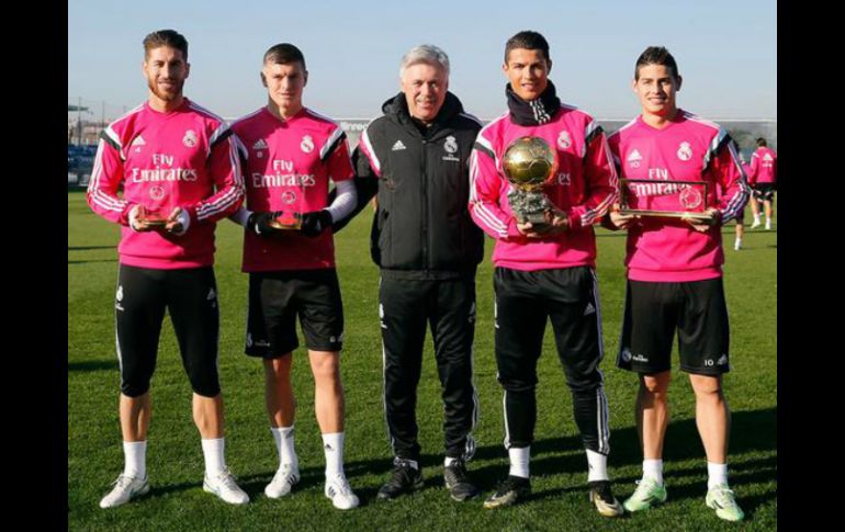 Deportes | El jugador de Real Madrid luce su trofeo y la plantilla lo felicita por su logro Cristiano Ronaldo y compañeros posan con el Balón de Oro El jugador de Real Madrid luce su trofeo y la plantilla lo felicita por su logro Por: SUN 13 de enero de 2015 - 08:52 hs MADRID, ESPAÑA (13/ENE/2015).- Cristiano Ronaldo consiguió su tercer Balón de Oro tras imponerse como ganador ante el argentino Lionel Messi y al portero alemán Manuel Neuer. Además, el jugador luso estuvo dentro del Once Mundial de la FIFA del 2014. Antes del entrenamiento de este martes, toda la plantilla del Real Madrid posó para la foto con el "Comandante" y lo felicitaron por el premio obtenido en el campo uno de la Ciudad Real Madrid. Toni Kroos y Sergio Ramos, respectivamente, exhibieron su premio recibido por entrar en el Once Mundial. Asimismo, James Rodríguez ostentó el Premio Puskas por el mejor gol del 2014. El cuadro Merengue regresó a los entrenamientos y empezó a preparar su partido de vuelta de los octavos de final de la Copa del Rey ante el Atlético de Madrid. El cuadro Colchonero tiene ventaja de dos goles. Temas Balón de Oro Futbol Internacional Cristiano Ronaldo Real Madrid Lee También Futbol hoy 22 de octubre de 2025: ¿Dónde ver los partidos en vivo? ¿Cuánto vale la 'Hormiga' González, joya de Chivas que ya es pretendida fuera de México? Atlas busca revancha ante León en el Estadio Jalisco México se impone a Países Bajos y respira en el Mundial Sub-17 Femenil Recibe las últimas noticias en tu e-mail Todo lo que necesitas saber para comenzar tu día Registrarse implica aceptar los Términos y Condiciones