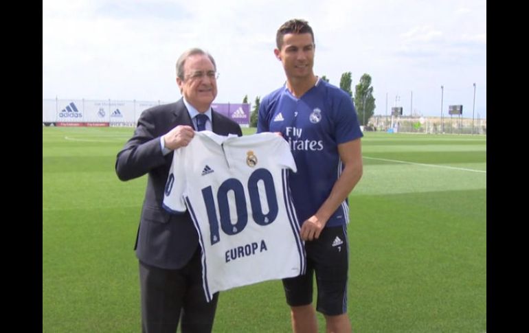 MADRID, ESPAÑA (13/ABR/2017).- El delantero portugués Cristiano Ronaldo recibió una playera conmemorativa por los 100 goles que ha anotado en competencias europeas, tras firmar un doblete en el partido ante Bayern Múnich.En el duelo de cuartos de final de la Champions League en el Allianz Arena, “CR7” logró la cifra histórica, por lo que antes del inicio del entrenamiento en la Ciudad Real Madrid, el presidente Florentino Pérez le entregó la camiseta.“Quiero agradecer el regalo al Real Madrid, a mis compañeros y a la afición. Es un honor muy grande hacer 100 goles en Europa. Fue un día especial, con una victoria importantísima”, subrayó.Cristiano agradeció al club Merengue la oportunidad de hacer una carrera brillante, además de reconocer a sus compañeros.“Cuando empecé a marcar goles en la Champions jamás pensaba que iba a batir este récord. Para mí es un honor porque es una cifra muy difícil. Estoy encantado y muy contento", sentenció.