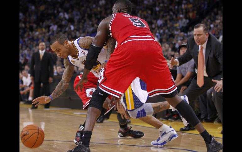 OAKLAND, CALIFORNIA (27/DIC/2011).- Stephen Curry aportó 21 puntos y 10 asistencias, Monta Ellis anotó 26 puntos y los Warriors de Golden State vencieron el lunes a los Bulls de Chicago 99-91, dando al entrenador novato Mark Jackson su primera victoria en cualquier nivel.