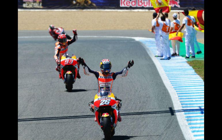 JEREZ DE LA FRONTERA, ESPAÑA (07/MAY/2017).- El piloto español Dani Pedrosa (Honda) ganó este domingo el Gran Premio de España de MotoGP, disputado en el circuito de Jerez de la Frontera.Pedrosa, que salió desde la 'pole' y dominó la carrera de principio a fin, se impuso a sus compatriotas Marc Márquez (Honda), que fue segundo, y Jorge Lorenzo (Ducati).Lorenzo logró así su primer podio con Ducati, equipo al que llegó esta temporada.Pedrosa, que consiguió su tercer GP de España, consideró que fue una competición dura y que "a mitad de la carrera Marc Márquez empezó a ir rápido y me metió presión, pero yo pude mantener mi ritmo", dijo al canal Movistar tras la carrera.El español marcó un tiempo de 45:26.827, dejando a Márquez a 6.136 y a Lorenzo a 14.767."Lo he intentado hasta el final y a falta de tres vueltas tuve un gran susto, así que pensé que la segunda era una buena posición", afirmó a Movistar Márquez, vigente campeón de la categoría.El italiano Valentino Rossi (Yamaha) entró en la 10ª posición, pero se mantiene como líder del Mundial de la categoría con 62 puntos, dos más que su compañero de equipo Maverick Viñales, y cuatro más que Marc Márquez, que es tercero.