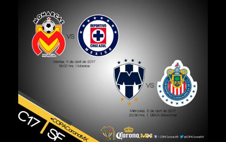 CIUDAD DE MÉXICO (23/MAR/2017).- Quedaron confirmadas las fechas y horarios para los partidos de semifinales de la Copa MX.Morelia recibirá a Cruz Azul en el estadio Morelos el próximo 4 de abril a las 19:00 horas.Mientras que los Rayados de Monterrey jugarán en el estadio BBVA Bancomer contra las Chivas del Guadalajara el próximo 5 de abril en punto de las 20:30 horas.