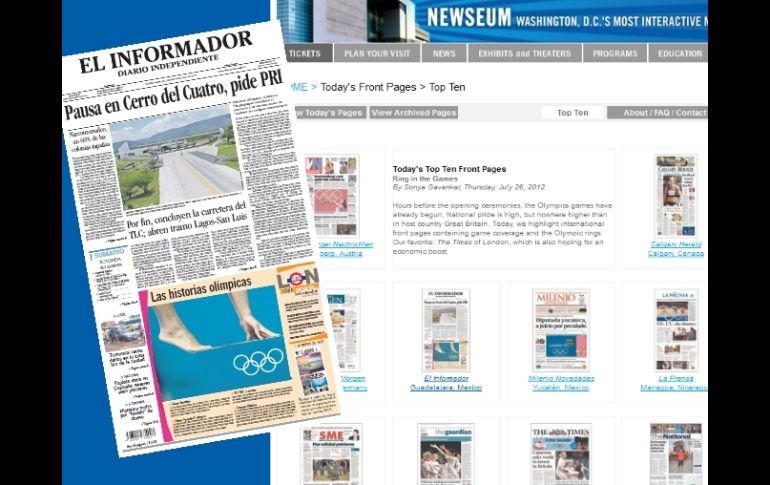 Deportes | El sitio Newseum.org destaca las mejores portadas de diarios en el mundo EL INFORMADOR, en 'top ten' por cobertura de Londres El sitio Newseum.org destaca las mejores portadas de diarios en el mundo Por: EL INFORMADOR 26 de julio de 2012 - 11:13 hs Cada día el museo interactivo selecciona 10 cubiertas de diarios de todo el mundo. ESPECIAL / GUADALAJARA, JALISCO (26/JUL/2012).- Este jueves, Newseum.org, la página del museo interactivo de noticias y periodismo de Pennsylvania, encargada de analizar medios a nivel internacional, eligió la portada de EL INFORMADOR como una de las 10 mejores portadas de este día por su información previa a la apertura de los Juegos Olímpicos. La portada de este medio destaca en un recuadro la fotografía de los entrenamientos en el Centro Acuático y algunos extractos de las noticias destacadas del día. Se incluye, además, la invitación a visitar la cobertura especial en la página de Internet www.informador.com.mx y el suplemento especial que se publica a partir de hoy. En la página se puede leer el siguiente texto con el criterio con el que fueron elegidas las publicaciones: "Horas antes de la ceremonia de inauguración, los Juegos Olímpicos ya comenzaron. El orgullo por las naciones es alto pero en ningún lugar tanto como en el país organizador, Gran Bretaña. El día de hoy, resaltamos las mejores páginas internacionales, que contienen cobertura de los Juegos Olímpicos. Nuestra favorita es la de "The Times" de Londres, que menciona que espera un impulso económico para el país". Además de EL INFORMADOR, en la lista también resaltan las portadas de periódicos como el londinense "The Guardian" y "The National" de los Emiratos Árabes Unidos. De América Latina destaca "La Prensa" de Nicaragua y "Milenio Novedades" de Mérida, Yucatán. Temas Páginas Web Juegos Olímpicos Londres 2012 Medios de comunicación Lee También Los verdaderos enemigos de Sheinbaum La labor continúa Flavia Pennetta y Francesco Bagnaia, entre portadores de la antorcha olímpica 2026 México alcanza cinco plazas para los Juegos Olímpicos de Invierno 2026 Recibe las últimas noticias en tu e-mail Todo lo que necesitas saber para comenzar tu día Registrarse implica aceptar los Términos y Condiciones